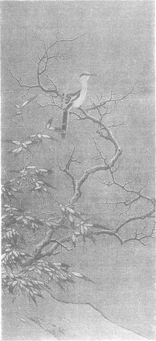 南宋。李迪(见“李迪风雨归牧图轴”条目)绘。绢本设色。纵116.1厘米,横53厘米。上海博物馆藏。图中描绘雪色寒天之下,一株枯树斜生于坡岗之间,老干虬曲盘错,枝杈细劲如爪。一只伯劳安栖于树杈高处,灰背、白腹、黑翅尾,羽毛丰满,神情自若,毫无畏寒缩瑟之态。树下篁竹丛生,竹枝轻挺舒展,纷披的竹叶上覆盖着块块积雪。天色阴晦,细雪漫飞,自然界呈现出一派荒寒寥落的景象。此图笔法工整,设色雅致。坡树以粗笔勾勒,再辅以水墨皴染。竹叶双钩填色,笔法较细,而栖鸟描画则更为工细。图中款署“淳熙丁未岁李迪画”。可知创作时间应为淳熙十四年,即公元1187年,是作者中年的一幅精心之作。此图曾经清人高士奇、谢松洲递藏,后入清内府。《书画记》、《虚斋名画录》著录。