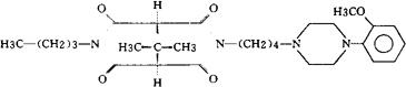 C28H40N4O5=512.65 CAS-107736-98-1 N-丁基-N′-[4-[4-(邻-甲氧苯基)-1-哌嗪基]丁基-2,2-二甲基-1,1,3,3-丙烷四酰1,3∶1,3-二亚胺。 N-Butyl-N′-[4-[4-(o-methoxyphenyl)-1-piperazinyl-]butyl-2,2-dimethyl-1,1,3,3-propanetetracarboxylic 1,3∶1,3-diimide. 3-丁基-7-[4-[4-(2-甲氧苯基)-1-哌嗪基]丁基]-9,9-二甲基-3,7-二氮杂双环[3.3.1]壬烷-2,4,6,8-四酮。 3-Butyl-7-[4-[4-(2-methoxyphenyl)-1-piperazinyl]butyl]-9,9-dimethyl-3,7-diazabicyclo[3.3.1]nonane-2,4,6,8-tetrone. 抗焦虑药。 Umespirone. INN,USAN.