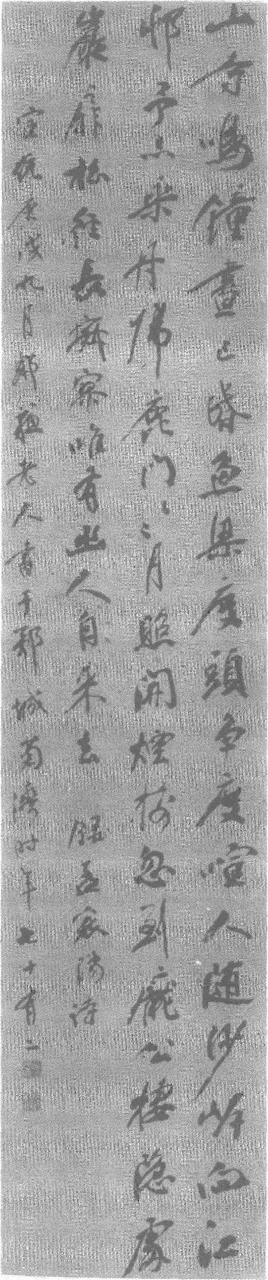清。纸本。纵164厘米,横35.5厘米。北京故宫博物院藏。杨守敬(清道光十九年—民国四年,即公元1839—1915年),字惺吾,号邻苏,湖北宜都人。同治元年(公元1862年)举人。精通历史、地理、金石之学。曾任两湖书院地理教习及勤成学堂总教长。辛亥革命后避居上海,后受袁世凯之聘任参政院参政。著有《历代舆地图》、《水经注疏》、《日本访书志》、《寰宇贞石图》、《学书迩言》、《晦明轩稿》等。其书法初法欧阳询,继而学颜、苏,又融进魏碑、汉隶笔法,行笔略带涩势,遹郁与俏丽兼而有之,自成一家。同时对日本书道有极大影响。此件,行书录孟浩然《夜归鹿门歌》七言古诗一首,淳稚古朴,纵敛有度,具有独到的意蕴和书法内含,是其行书佳作。