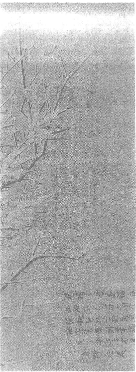 南宋。杨无咎(见《杨无咎四梅图卷》条目)绘。纸本墨笔。纵27.1厘米,横144.8厘米,北京故宫博物院藏。此图描绘一簇腊梅在雪色寒天中偃仰恣纵,团花竞胜的秀态。梅枝从画卷的左上角斜伸下来,枝条细劲舒展,梅朵圆润光洁,几片稀疏的竹叶映带左右。天色晦冥,梅干竹枝上的积雪散发出梦幻般的光泽,清凛高洁之气溢出画外。此图布局舒朗,笔法简逸,泼墨写枝,细笔勾花,作为背景的天色以淡墨晕染烘托,风格清新,意韵高远。图中钤〈草玄之裔〉、〈补之〉、〈逃禅〉三印,画卷首尾写有南宋海野老农的题诗及短跋。引首有清高宗弘历的诗、题,后幅有元人顾德璋、李升,明人唐幼明、吴宽、吴勤、李澄之,清人高士奇等人的题跋。《式古堂书画汇考》、《江村销夏录》、《江村书画目》、《石渠宝笈初编》著录。