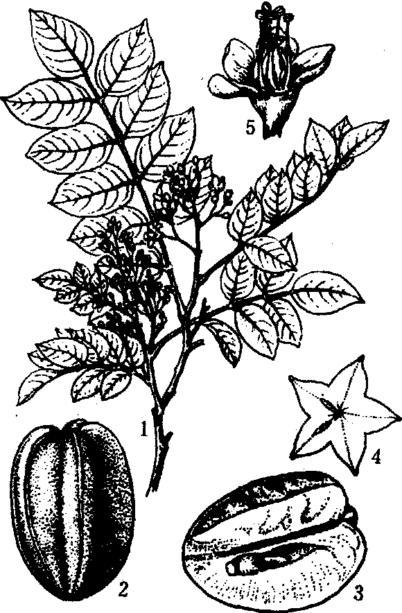 释义 | ![]() ![]() ![]() ![]() ![]() 杨桃【同义】总目录 杨桃五歛子 水果 水果桃:桃(桃子;雪~;早~;蟠~;扁~;蹊~) 仙果 仙木 妖客 余甘尉 短命花 ☚ 果实名 穗子 ☛ 杨桃carambola杨桃科杨桃属热带常绿果树, 小乔木。又名五敛子、阳桃、洋桃。学名Averr-hoa carambola L.。此外,尚有一种多叶高酸杨桃(A.bilimbi L.), 仅中国台湾省有少量试栽。 杨 桃 1. 花枝; 2. 果; 3. 果实纵剖面; 4. 果实横剖面; 5. 花 品种类型 普通杨桃有甜和酸两个类型。酸杨桃一般树型高大, 枝条略向上举。小叶比甜杨桃多1~2对。花序稍大, 花色较浓紫。果形瘦削,果顶部稍尖,肉质较粗而味酸。但抗逆性较强,丰产, 常做砧木或加工用。甜杨桃为主要栽培种。中国广东产区的品种有崛督、尖督、刘十杨桃, 周家种、林泉嘴金钱杨桃等。崛督丰产优质,尖督抗逆性较强, 刘十杨桃果大、早熟。台湾省品种有蜜丝种、二林种、白丝种、五汴头反种及南洋种等。品质以蜜丝种最佳, 栽培以二林种最广。广西和福建的品种, 大都由广东引进。 栽培技术要点 杨桃繁殖采用靠接、切接、劈接和补片芽接均可。砧木宜采酸杨桃的种子,洗去胶质,阴干、于10月前秋播或保存至次年2月至3月春播。秋播要护苗越冬,春季分床,当苗高50厘米以上茎粗1厘米左右, 便可嫁接, 每年3月至8月均可进行。种植方式每一大畦种单行、双行或三行,株行距5~6米, 每公顷种300~360株, 植期于3月至4月间进行。成年树施肥宜于春梢前、小果期、采果后及越冬前进行。幼树着重整形,青壮年树宜疏除树冠上层营养枝以抑制生长, 老弱树则培养树冠上部枝条以荫蔽树干, 并充分利用徒长枝填补树冠空位和更新老枝。果园管理宜注意排灌水、防风、防寒。主要虫害有: 鸟羽蛾幼虫为害花果, 酷热天气为害最烈; 黑点褐卷叶蛾幼虫蛀食果肉。此外, 还有果实蝇及毒蛾幼虫等为害果实。病害有叶的赤斑病和果的炭疽病。冬季清园是防治病虫害的关键性措施。 经济价值 杨桃供鲜食, 也可加工制罐头、果酱、果汁、蜜饯; 酸杨桃可加工制果汁、或佐餐调味品。营养成分含有蛋白质、脂肪、碳水化合物, 可食部分100克的热量为28千卡; 含有胡萝卜素、硫胺素、核黄素、尼克酸和抗坏血酸等; 矿物盐含有钙、磷、铁和钾、钠、镁等成分。叶、果、花、根和树皮均可入药, 对肠胃、呼吸系统和外科用药, 有一定辅助疗效。 杨桃药名。见《生草药性备要》。即阳桃,详该条。 杨桃carambolaAverrhoa carambola L.,又称五敛子、羊桃、阳桃。酢浆草科,杨桃属。常绿小乔木或灌木。2n=24。原产亚洲东南部,东南亚诸国均有栽培,中国广东、广西、福建和台湾等省区均有种植。树高6~7m。奇数羽状复叶,小叶5~13片,卵圆或椭圆形,先端尖,全缘。花小,钟形,多数集生成聚伞圆锥花序,腋生或着生于枝干上,花瓣白色或紫红色;子房上位,五室。果为肉质浆果,五棱,成熟果实黄绿色或淡黄色,表面光亮;肉质厚,软而多汁,有甜、酸两类。一年中能多次开花。性喜高温多湿,喜阴。用播种或嫁接繁殖。除鲜食外,可制罐头、干果、蜜饯等。 杨桃 杨桃 杨桃学名叫五敛子,分为甜、酸两大类。酸杨桃果实大而味酸,俗称“三稔”,多用作烹调配料或蜜饯原料,甜杨桃作水果吃。杨桃青边红肉,清甜无渣,有桂花蜜的味道,又称之为“红果”。杨桃含有对人体健康有益的多种成分,对治疗胃病、黄疸、痢疾等有一定的疗效。 ☚ 腰果(树花生) 荔枝 ☛ 杨桃carambola |