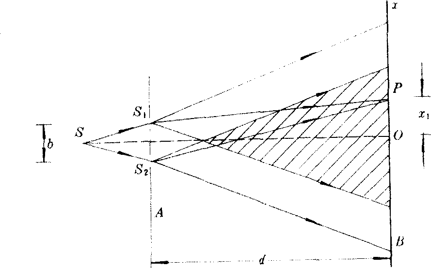 2分别为与x轴方向垂直的缝光源和狭缝时,就是杨氏双缝干涉实验。在这个实验中,屏B上呈现明暗相间的直条纹,条纹与x轴方向垂直,并且比双孔时更为明亮,条纹与x轴相交的位置与双孔的x轴上的极值位置相同。相邻明条纹(或暗条纹)的间距均为△x=dλ/b。
