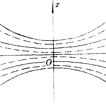 最早的双光束分波面干涉实验。英国物理学家T.杨在1801年所做,有双孔和双缝两种。杨氏双孔实验如图1所示,不透明屏A上有两个相同的针孔S1和S2,单色点光源S在S1和S2连线的垂直平分线上,B为远离A的观察屏。从S发出的球面波的波阵面上,孔S1和S2截出两小面元,它们通过小孔S1和S2衍射,相当于在S1和S2处有两个子光源。它们发光的初位相相同,在它们发出的(衍射)光束的重叠区域(图1中阴影部分)产生干涉。屏B上可观察到明暗相间的干涉条纹,形状为双曲线(图2)。S所在的S1和S2连线的垂直平分线与屏B的交点为O,是屏B上x轴的原点,P点在x轴上,到O点的距离为x。屏A到B之间的距离为d,取空气的折射率为l,当d>>b,x时,S1和S2到P点的光程差为△≈bx/d。若P点在O点附近,可以认为S1和S2在P点产生的光振动振幅近似相等,记为A0,则沿x轴的光强分布为