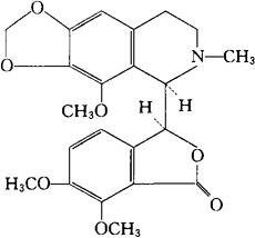 C22H23NO7=413.43 CAS-128-62-1 6,7-二甲氧-3-(5,6,7,8-四氢-4-甲氧-6-甲基-1,3-二氧杂环戊烯并[4,5-g]异喹啉-5-基)-1(3H)-异苯并呋喃酮。 6,7-Dimethoxy-3-(5,6,7,8-tetrahydzo-4-methoxy-6-methyl-1,3-dioxolo[4,5-g]isoguinolin-5-yl)-1(3H)isobenzofuranone. 镇咳药。用于干咳。 那可汀,诺斯卡品。 Narcotine,Tusscapine,Noscapine. 乐咳平片,乐咳平干糖浆。 INN,BAN,BP,DCF,EP,FP,JP,NFN,USAN,USP,MI.  |
