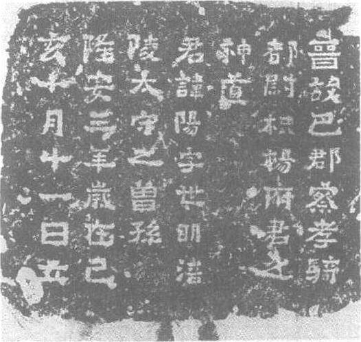 东晋隆安三年(公元399年)十月十一日刻。全称《晋故巴郡察孝骑都尉枳杨阳神道阙》。清陆增祥《八琼室金石补正》载:“高一尺一寸,广一尺三寸七分”“字径一寸二分。”清末四川省巴县出土,曾归姚观元、端方、周进所藏,北京故宫博物院藏。碑文共7行,行7字,结体厚重方拙,用笔浑朴,似楷书又夹有隶书笔意,是研究我国书法隶书向楷书过渡的一件重要实物资料。清康有为《广艺舟双楫》云:“《枳杨府君》(即《杨阳神道阙》)茂重,为元常正脉,亦体出《谷朗》者,诚非常之瑰宝也。”“笔法之佳,固也。考其体裁,可见隶楷之变”,“真魏晋之宗风也。”北京故宫博物院还藏有此碑的初拓本。清叶昌炽《语石》、康有为《广艺舟双楫》等书均有著录。