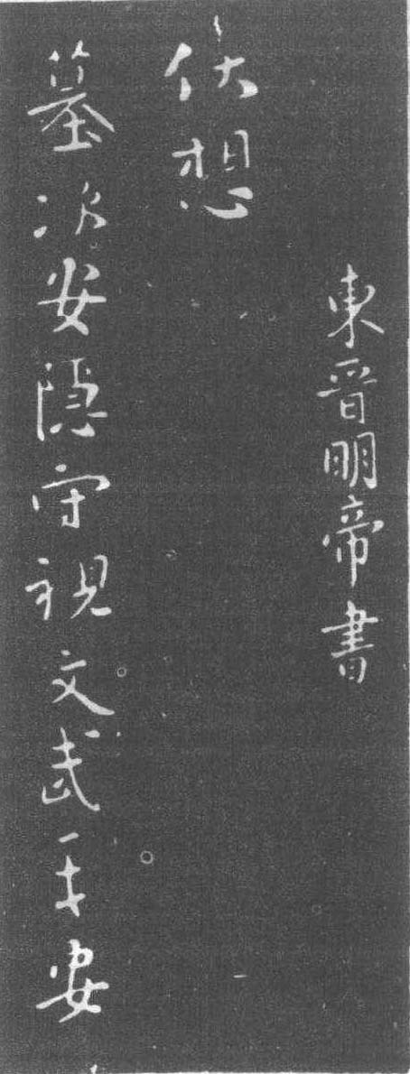東晉明帝·墓次安隱帖 (局部) (晉·元康九年——東晉·太寧四年 299~326)温縣人。字道畿。元帝長子,東晉第二代君主。性至孝,善撫將士,時王導輔政,朝多賢俊。王敦舉兵内向,帝親征,大破敦軍。在位三年崩,謚明,廟號肅宗。帝工書畫,兼擅鑒識。《歷代名畫記》稱其書“頗得神氣,筆迹超越。”所書 〈墓次安隱帖〉,為行書 “伏想墓次安隱”云云二行十二字,係葬父元帝後,慰問守視之文武百官書,故墓次字提行書寫。帝以至孝著聞,清王澍謂其“孝敬之意油然筆墨間。”字法端謹,頗富古意,高雅遒勁,當屬佳品。隱即穩,古時通用。刻入《淳化閣帖》等。圖為 〈墓次安隱帖〉。 |