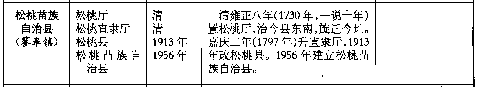 松桃苗族自治县(蓼皋镇)松桃厅松桃直隶厅松桃县松桃苗族自治县清清1913年1956年清雍正八年(1730年,一说十年)置松桃厅,治今县东南,旋迁今址。嘉庆二年(1797年)升直隶厅,1913年改松桃县。1956年建立松桃苗族自治县。