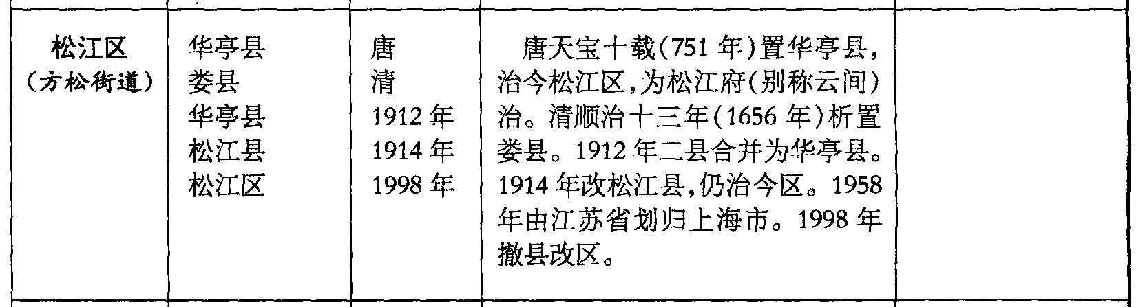 松江区(方松街道)华亭县娄县华亭县松江县松江区唐清1912年1914年1998年唐天宝十载(751年)置华亭县,治今松江区,为松江府(别称云间)治。清顺治十三年(1656年)析置娄县。1912年二县合并为华亭县。1914年改松江县,仍治今区。1958年由江苏省划归上海市。1998年撤县改区。