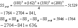 再按四因素分别计算各水平的合计: A,血清种类: 兔1827.67,胎盘1356.48;B,血清浓度: 5% 1530.24,8% 1653.91; C,基础液: 缓冲剂1056.95,蒸馏水1081.04,自来水1046.16; D,维生素: 加1602.76,未加1581.39;总计: 3184.15。 总变异的离均差平方和,由表5数据计算,得 (2)四因素各水平间变异的离均差平方和。 (3)一级交互作用的离均差平方和。包括所有每两个因素的交互作用,共六项。A×B交互作用计算见表7。 表7 A×B交互作用副表(据表6)