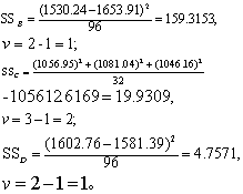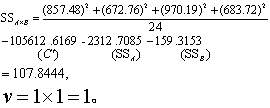 仿式(1)与式(2)推广计算如下: 其余3个二级交互作用的离均差平方和及其自由度之计算方法仿此,算式从略,结果为SSA×B×D=139.6596,v=1×1×1=1;SSA×C×D=24.0976,v=1×2×1=2; SSB×C×D=8.4369,v=1×2×1=2。 (5)三级交互作用的离均差平方和。全部四个因素的交互作用,只有一项,根据表6数据计算。仿式(1)与式(2)推广计算如下: (6)误差的离均差平方和。从总变异的离均差平方和内减去所有单因素变异和一、二、三级交互作用的离均差平方和,为剩余变异,即误差;自由度的计算方法同此。 表9 表5资料的方差分析