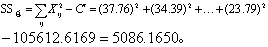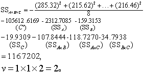 按式(1)与式(2)合并计算如下: (4)二级交互作用的离均差平方和。包括所有每三个因素的交互作用,共四项。A×B×C交互作用计算见表8。 表8 A×B×C交互作用副表(据表6)