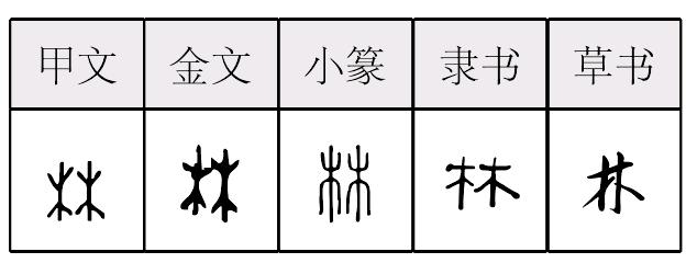 ❹ 单木不林|酒池肉林|深山老林|深山密林|啸聚山林 林林,甲骨文作 ,金文作 ,小篆作 。 从二“木”會意,表示成片樹木,引申指聚集在一起的許多人或事物。卜辭或用作方國名。銘文或用本義,或用爲人名。 楚簡帛文作 ,秦簡牘文作 ,古今字形變化極小。 林lín会意字,双木成林。作声符生成的字有: lín 淋(淋漓) 琳(琳琅满目) 霖(甘霖) 啉(卟啉) bīn 彬(文质彬彬) chēn 郴(郴州,地名,在湖南省) 相关链接 1.“焚”(fén),火烧木,为会意字。其音似仿“棼”(fén)而得。 2.“郴”以“森”(sēn)为声符,省作“林”。森,会意字。《说文》:“森,木多貌。”与“深”音相近。“深林杳以冥冥兮,乃猿猱之所居。”(屈原《涉江》)“深林”即“森林”。 林(lín)“ ,平土有丛木曰林。从二木。凡林之属皆从林。”(力寻切) 徐锴《系传》:“丛木故从二木,平土故二木齐。”段玉裁注:“《周礼·林衡》注曰:‘竹木生平地曰林。’《小雅》:‘依彼平林。’传曰:‘平林,林木之在平地者也。’” 甲骨文作 ,金文作 ,均象两棵树并立,为同体会意字,表示树木众多。卜辞中借用为方国名和地名。金文中可作森林义,如胤嗣 壶:“于彼新野,其旝如林。”[1] 林部有八个属字。如“楚”字下云:“丛木。一名荆也。从林,疋声。”“森”下云:“木多皃。从林,从木。” 林lín(8画)
