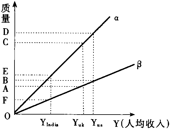 我们用一个图来更清楚地解释林德的这一思想。图中Oα和Oβ两条射线所围成的锥形代表了一国对其需求产品的质量的变动范围,在这一范围内越高的点所代表的产品质量要比越低的点所代表的产品质量要更高级,换言之,在任一给定的人均收入水平上,对工业制成品或奢侈品的需求离Oα线越近,而对必需品或初级产品的需求则离Oβ线越近。注意到根据恩格尔定律,人均收入Y越高,所需求的产品质量越高,即越需要工业制成品,所以Oα、Oβ都正向倾斜。设有三个国家,美国、英国与印度,其各自的人均收入水平为Yus、Yuk和YIndia,美国所需求的产品的质量范围为BD,英国为AC,印度为EF,BC为英、美两国的重叠需求部分,两国会就BC品质范围内的产品进行贸易,而美、印两国的重叠需求为EB部分,决定了美印两国的贸易范围也仅为EB,由此可见人均收入水平相近的美英之间的贸易量要远大于人均收入相差很大的美印之间的贸易量,这正是真实世界的情形。