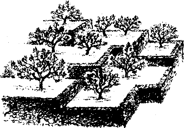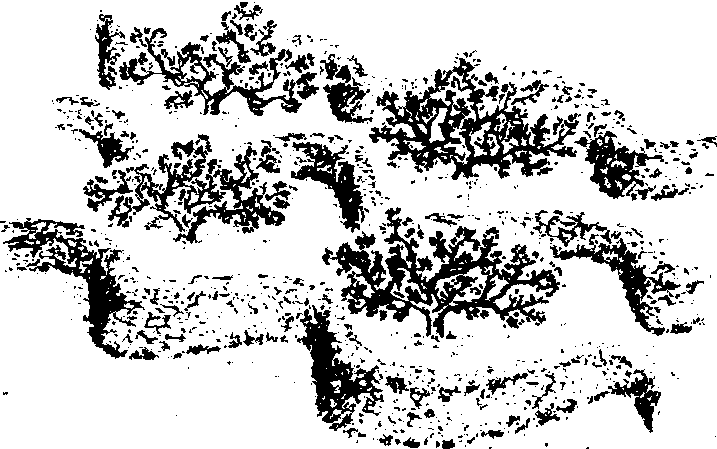 梯田阶面可以设计成水平式、内斜式或外斜式。一般情况下多采用水平式, 但阶面不能呈绝对水平, 而应保持0.2~0.3%的比降, 以利大雨时排出过多的雨水, 避免冲坍梯田; 在雨量充沛、土层较深的果园,可采用内斜式; 在雨量少、土层浅的果园, 可采用外斜式。不论内斜式或外斜式, 斜度不宜超过5°, 以免引起土壤冲刷。阶面外沿设置高约20厘米、底宽40厘米的边埂,以防雨水冲毁梯田壁。水平式或内斜式阶面,在阶面里边距梯田壁基部50厘米处, 沿梯田壁走向设置内沟, 通向总排水沟。内沟深约35厘米, 底宽30~40厘米。沿内沟每隔50~20米挖一深宽约60厘米、长约100厘米的沉淤坑。内沟和沉淤坑相连接以便蓄水、排水和沉积泥土。 山地果园最好是先修筑梯田, 后栽果树。行距宜大, 株距宜小, 有利于果树生长和管理。如果阶面宽度只能栽一行果树,则果树宜栽在阶面土层较深处,有利于果树生长和便于管理。 图 4 等高线修整示意 梯田修筑 先在每个果园小区内, 选坡度适中而有代表性的坡面, 沿坡上下设一基线, 根据梯田阶面宽度在基线上定点作为测等高线的基点,测出等高线。由于地形和坡度的起伏变化,等高线常呈弯曲走向,为了修筑梯田和栽植果树的方便,对等高线应按“大弯就势, 小弯取直”的原则进行修整,使各等高线比较整齐一致。上下两条等高线的距离, 过宽的地方, 可以加一行等高线; 过窄的地方可以减一行等高线(图4)。调整后的等高线, 就是以后阶面的中轴线。梯田宜从上坡向下坡修筑, 边筑阶壁, 边填阶面。把原来坡面削高填低, 表土填于底层, 心土填于表层, 直到将阶面修成按设计的要求。然后再在阶面外沿修边埂, 内沿挖内沟和沉淤坑。在不能先修梯田后栽果树时, 应在测好等高线后, 沿等高线按株距要求先栽植果树, 以后就在上下两行果树之间修筑梯田壁。修筑梯田时,要使阶面与果树的根颈等高(图5)。 ![]() 图 5 梯田的构造 管理和维修 土壁梯田的阶壁和鱼鳞式梯田的坡面, 还存在一定的坡度与坡长, 可用种草的办法解决冲刷问题。阶面宽度超过7米的土壁梯田, 在阶壁上可种植紫穗槐等小灌木, 减少冲刷。 新修的梯田,因土壤重力、降雨、或灌溉的影响,梯田填土部分逐渐沉实, 会出现阶面外倾或下陷, 应及时进行修整。新老梯田在每次大雨之后, 需全面检查, 及时修复损坏部分。每年春季结合土壤管理, 宜对边埂和背沟修整一次。 |