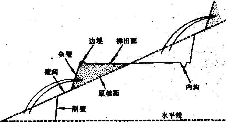 释义 | 果园梯田terraced orchard将山坡地改为台阶园田,用于栽植果树的一种水土保持工程措施。梯田适于5°~20°坡度的山地,消除了果树栽植面上的坡度, 缩小了集流面, 从而削弱地面径流的速度和流量, 防止果园土壤面蚀与沟蚀, 维护果树根系的正常生长, 保持树势壮健。修筑的原则, 要求投工少, 成本低, 既能充分利用坡地, 又便于果树管理。梯田结构合理牢固, 水土保持的效益显著持久。中国宋代范大成《骖鸾录》中就有梯田的记载“袁州(江西宜春)岭阪上皆禾田, 层层而上至顶名曰梯田。”“下自横麓,上至危巅,一体之间,裁作重磴”“叠土相次, 包石成田。” 图 1 台阶式梯田 图 2 复式梯田 图 3 鱼鳞式梯田 梯田设计 果园梯田由阶面( 梯田面)、梯田壁、间壁、边埂和背沟等组成。阶面的宽度和梯田壁的高度, 主要取决于山地坡度的大小和土层的深浅。阶面宽、种植面积大、保土保水力强, 果树管理方便。但在不同坡度情况下, 阶面宽度每增加一倍, 梯壁也增高一倍, 填土量增加三倍, 施工费用大量增加。故坡度小、土层深、树体大者, 阶面可以宽些; 反之可以窄些,但至少以能栽植一行果树为限。梯田壁高度、阶面宽度和坡度的关系如表。在果园地形和坡度多变的情况下, 为了节省修筑梯田的人力, 可以使各梯田壁的高度基本相同, 而阶面的宽度则可以不同, 即形成等高不等宽的梯田。 梯田壁可用土或石筑成。在坡度大、附近石料多的地方, 可筑成石壁梯田。石壁梯田寿命长, 梯田壁可筑垂直壁, 阶面就相对较宽; 在坡度小,土层深,又缺乏石料的地方, 可筑成土壁梯田。为了防止土壁坍塌, 常筑成向阶面倾斜30°~40°的土壁。土壁由切壁和垒壁两部分构成,原坡面以下的梯田壁部分为切壁,以上部分为垒壁。切壁土质坚实,倾斜度可以较小,垒壁则由上下坡取土筑成, 土质松软, 易受冲刷, 因此倾斜度可较大。如果土壁较高, 还可以在切壁和垒壁之间留一壁间,以加固梯壁。 坡度与阶壁和阶面的关系