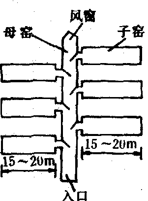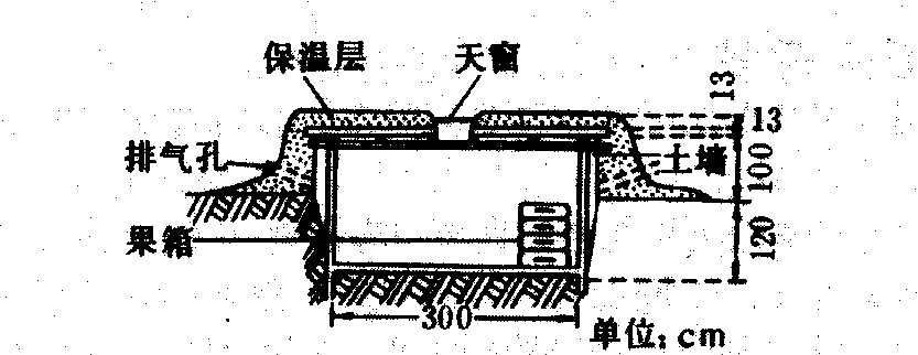 果蔬贮藏窖fruit and vegetable storage cellar建于地下或半地下用于贮藏果品或蔬菜的一种建(构)筑物。一般多建在地下水位较低和窖内外温差较大的地区。其原理是利用土壤较强的热稳定性,降低外界气温对窖内温度的干扰,从而为果品或蔬菜创造稳定而适宜的温、湿度贮藏环境。 果蔬贮藏窖按贮藏的货物可分为菜窖和果窖。按窖的埋置深度可分为全地下窖和半地下窖。全地下窖全部设置在地面以下;半地下窖顶部露在地面以上。前者保温能力优于后者,但不便于货物进出和管理。 菜窖 分临时性菜窖和永久性菜窖。建窖一般选择地下水位较低和空气流畅的地点。气温较高或水位较高的地区多采用半地下式菜窖,窖身入土深1~1.5米,在四周筑起高0.66~1米的土墙。在寒冷或地下水位较低的地区多采用地下式菜窖,窖身全部建在地下,入土深2.5~3米,仅窖顶露出地面,与半地下式窖相比,地下式保温能力强,可避免冻害。菜窖的宽一般2.5~3米,长度视贮量而定(16~50米),棚顶用料就地取材,一般用木料搭好棚架,架上铺秫秸,秫秸上面覆土压实,秫秸和覆土厚度视当地气温而定。窖顶设天窗或气孔,天窗的开设方式有两种:一种是沿窖顶长方向通长设置,即为条缝式;另一种是沿窖顶长方向每隔一定距离设置一个。 果窖 按建筑形式分为井窖、窑窖和棚窖三种。❶井窖:全部建在地平面以下,形似“三角瓶”,结构简单,建造费用低,不易坍塌,但窖的贮量小,操作管理不便,占地面积较大。井窖的结构分为窖口、窖颈和窖身三部分,可建在室内,也可建在室外。室内窖受外界气温影响小,果品贮藏初期窖温较高,后期温度低,利于延长果品贮藏时间,室外窖受外界气温影响大,贮藏初期窖温比室内窖低,但贮藏后期升温快,贮藏期比室内窖短。为弥补上述不足,可在室外建造双层窖(图1)。即在上窖底再挖一个窖,果品先存在上层窖内,后期气温回升后,移至下层窖继续贮藏。 ❷窑窖:按构造不同分为土窑窖和地下砖窑窖。土窑窖是把向阳、短小、无通气筒和窖门保温结构的住房,改为果品自然通风贮藏窖。窖口向北、缓坡向下,深入地下,加长窖身(25~50米),在窖身后部设通气筒(又称风囱),窖门设缓冲带。其原理是,在秋冬季,通过自然通风的方式,将自然冷源蓄入窖洞四周的厚土层内(顶部覆土厚5米以上)。贮藏结束后,封窖保冷,可使窖洞内温度周年维持在较低的水平,从而为果品贮藏创造良好的温度环境。土窑窖按窖体的排列组合方式可分为大平窖和子母窖两种(图2、图3)。大平窖为单体窖,子母窖则是在主窖上开挖出子窖,按子窖的排列形式又可分为“非”子形窖和“梳子”形窖。大平窖由窖门、窖身和排气筒三部分组成。窖门一般设有两道门,门宽0.8~1.4米,高2~3米,两道门之间的距离4~6米;窖身为贮果部位,窖身由窖门向内缓慢降低, 比降5%~10‰,窖身长30~50米;排气筒设于窖身后部,其尺寸主要取决于窖的贮藏容积。一般经验是筒下部直径1~1.2米,上部直径0.8~1米(也可建成直筒),高5~15米。通风量的大小主要取决于排气筒内断面积,尽可能采用大直径的排气筒。子母窖由主窖(通道),子窖和排气筒组成,主窖用于运输和通风,子窖贮果,窖门为进气口,在子窖的顶端设有排气筒。这种窖能充分利用地下空间,结构较合理,贮果量较大。地下砖窑窖是在吸收土窖洞贮藏原理基础上发展起来的另一种果品贮藏窑窖(图4)。这种窖在地面直接开挖后,再砌成顶部为圆拱形的窑窖,宽4~5米,侧墙高2米,墙厚37厘米,窖顶用厚32厘米砖拱,上部再覆土1.5~2米,窖长一般30~50米,地下砖窑窖多建在平原地区。这种窖的结构形式与大平窖相似,亦由窖门、窖身和通风系统组成。窖门为一较长的坡道,坡道长10~20米;窖身根据容量大小可建成单跨和双跨(或三跨);其通风系统有自然通风方式和机械通风方式两种,自然通风系统的构造与土窑窖相似,机械通风则在窖的后端设置轴流风机。自然通风不需动力,可用于缺电地区,但通风效果较机械通风差。为提高通风效果,宜使通风量大于每小时18次。 ❸棚窖:多为临时性建筑,形式多样,应用最为普遍,其构造同菜窖类似(图5)。