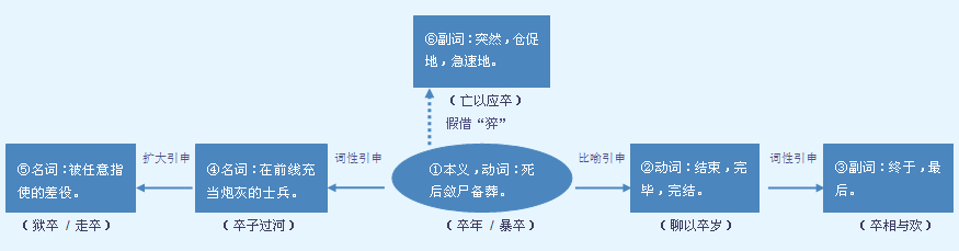 字源解说 卒,甲骨文字形 = (衣,服装)+ (爻,交错捆绑),在衣服上交错捆绑,也就是用绳索在裹尸布上交错捆绑,表示远古抛葬仪式前敛尸者给死者整理并固定衣着。造字本义:死亡后敛尸备葬。金文 将交错捆绑的绳索 简化成一撇指事符号。篆文 承续金文字形。隶书 将篆文的一撇 写成一横 ;将篆文的两袖两襟形状 写成两个“人” ,至此“衣”形尽失。 附 文言版《説文解字》:卒,隸人給事者衣爲卒。卒,衣有題識者。 附 白话版《说文解字》:卒,隶役听差者穿的衣服上写着“卒”字。卒,是隶役衣服上标记其听差身份的符号。 引申线索