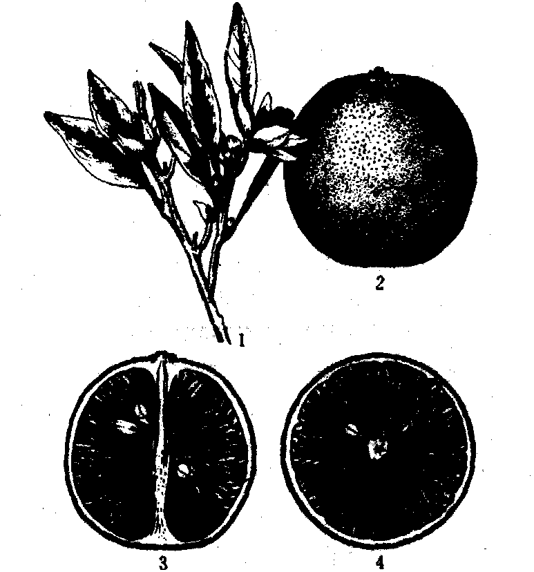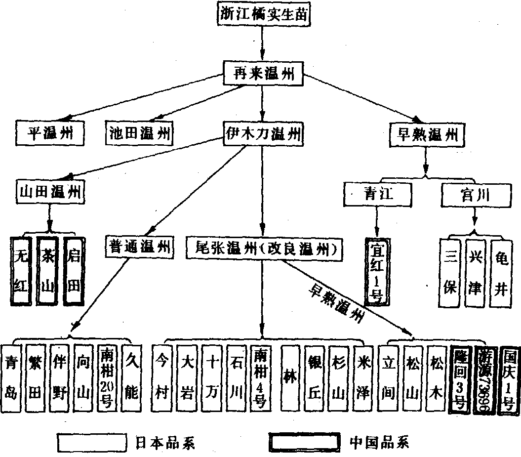 沙柑果大, 扁圆形, 风味好。 主要品种 温州蜜柑中最早栽培的品种称再来温州, 以后通过芽变、珠心苗选种等途径, 由再来温州进一步分化出几个新的品种和品系, 即平温州、早熟温州(如青江早生)、池田温州、伊木力温州、尾张温州(又称改良温州), 温州蜜柑的品种演变过程(图2)。 依其品种成熟早晚分为: 早熟系 ❶兴津。又名兴津温州、兴津早生、兴津2号。日本兴津园艺场用宫川为母本, 枳作父本授粉,从珠心系后代中选出, 是日本70年代的推广良种。中国引种试种成功, 现在四川、浙江、湖南、湖北、江西、贵州、广西、广东、云南、河南、江苏、陕西、甘肃等省(自治区)栽培。果较大, 高扁圆形, 果顶部宽而广凹,柱点中大,果基部圆或较狭, 形状似宫川。果面较粗糙, 鲜橙红色, 油泡大而凸出, 果皮中等厚,0.25~0.4毫米, 囊瓣8~13, 较整齐,果肉深橙红色。每100毫升果汁中含糖11.33克, 柠檬酸0.73克, 维生素C35.46毫克。糖酸俱高, 风味浓, 微香, 囊壁薄,细嫩化渣, 品质优良, 无核。10月上、中旬成熟。 ❷宫川。日本1905年从尾张中选出的芽变品种。中国于1924年起多次从日本引进, 现在全国柑橘产区均有栽种。果较大, 平均单果重120克以上, 圆锥状扁圆形,顶部宽广, 柱点附近平或微凹, 基部圆或较狭, 蒂周有环形瘤状隆起。油泡大而突出, 果面光滑, 凹点少而不明显, 沙囊粗短, 细嫩多汁, 甜酸适度, 风味稍淡, 品质中上,无核。10月中、下旬成熟。 ❸宫川(66)早生。中国1966年引进。比老系各方面性状均较佳, 尤以品质超过老系甚多。 ❹立间。中国1966年从日本引进, 果较大, 横径6.87厘米, 纵径5.30厘米, 果形指数1.29, 单果平均重153克, 卵球至扁圆形,顶部圆或平圆,柱点大,多开裂呈脐状, 基部平,萼凹生。果面橙色, 鲜艳, 富光泽,皮薄, 光滑, 油泡小, 微凸或平生, 皮厚0.2~0.3厘米, 海绵层很薄。8~13瓣,较整齐,中心柱开裂呈芒状,果肉深橙色。每100毫升果汁中含糖10.14克, 柠檬酸0.55克, 维生素C36.29毫克。糖高酸少,风味甜浓, 汁胞柔软, 囊壁厚, 细嫩化渣, 品质上。10月上、中旬成熟。 ❺松山早生。日本爱媛北宇和郡立间地方, 从尾张枝变中选出。果较大,扁圆形,很扁; 顶部平, 柱点大, 多开裂, 呈脐状, 果基不突起, 并有4~5条放射沟。果面橙色鲜艳,富光泽;油泡大而突出, 略显粗糙, 皮薄、囊壁薄,果肉鲜橙色。每100毫升果汁中,含糖9.61克, 柠檬酸0.65克,可溶性固形物11.4%。风味淡,糖酸较少, 品质中。成熟期较官川早约一周, 为仅次于宫川的优良品系。已引进的早熟系品种还有龟井早生,青江早生,以及从松木早生中选出的隆回73-01优良株系等。 中早熟系 ❶米泽。日本从普通温州中选出的芽变品种, 中国1966年引入, 四川、湖南、浙江有栽培。果实大,扁圆形,果顶部平, 柱点大。果基部亦平, 蒂周有明显的放射沟。油泡大而稀, 凸出明显, 果面凹点较多, 皮较粗糙, 深橙色, 较薄, 肉色橙红,无核,风味比普通温州稍淡, 品质中等。11月上旬成熟。 ❷山田。中国曾先后两次从日本引入浙江, 1924年引入温州,流传较广, 以浙江栽培较多, 其他省也有栽培。果实扁圆形, 顶端广, 蒂端狭, 果实中大,较均匀,单果平均重约100克。果皮较厚, 橙色, 油泡大, 凸出,表面鲜而亮,富光泽, 外观美, 白皮层较厚。每100毫升果汁中, 全糖9.52克, 酸1.08克。可溶性固形物13%。风味甜浓, 但囊壁厚, 不化渣,鲜食品质中上。囊瓣大小均匀, 深橙红, 汁胞较细长, 排裂紧密, 加工性能较好。成熟期比宫川、龟井稍迟,较尾张早, 丰产稳产, 果形美观, 商品价格高, 贮藏性能好。 ❸南柑20号。中国1966年引入。丰产、质优。每100毫升果汁中,全糖9.1克, 总酸1克, 可溶性固形物12%。品质好, 唯囊壁较厚。11月上旬成熟。中早熟系中还有浙江选出的元红温州、长桥等。 中熟系 ❶尾张。又名改良温州。是中国引进温州蜜柑中最早的品系之一。1916年起多次引进。在湖南、湖北、浙江、四川、广西、广东、江西等柑橘产区大面积栽培,是中国70年代以前主要温州蜜柑品系。果实中大, 平均约95克, 最大可达160克,扁圆形, 较整齐, 两端较对称, 果顶圆钝,柱点附近平或微凹,基部宽广平坦, 蒂部微凹, 具放射沟。皮深橙色, 稍光滑, 油泡小而密, 表面凹点较多, 汁泡细长, 排列紧密, 柔软多汁, 风味最浓, 甜酸适度, 无核, 品质中上。11月中、下旬成熟。 ❷林温州。1966年引进,在四川、湖南、浙江有栽培。果中小,纵横径6.61厘米×4.96厘米, 单果平均重97.9克, 扁球形, 顶圆钝, 柱点区微凹, 柱点大, 基部狭平, 两肩斜削, 萼附近隆状突起。果面橙色,有光泽,油泡明显, 有凹点大而稀, 皮厚0.3~0.4厘米, 囊瓣8~13, 大小整齐, 沙囊深橙色。每100毫升果汁中, 全糖9.07克, 柠檬酸0.85克,维生素C31.21毫克。风味浓, 囊皮厚。本品系树势强, 产量高, 枝叶密茂, 日灼与裂果均少。 ❸南柑4号。果中大, 横径5.76厘米, 纵径4.82厘米, 单果重111.5克,扁圆形, 顶部圆钝, 柱点区平或微凹, 柱点中大; 基部平圆, 萼凹入, 四周隆起。果面光滑间有凹点散布, 油泡中大, 凸出, 皮中厚, 质地致密, 包着较紧,皮厚0.3~0.4厘米, 囊瓣8~13,果肉深橙色。每100毫升果汁含全糖9.71克, 柠檬酸0.88克,维生素C23.24毫克。本品系生长旺, 丰产稳产,果小适于加工要求。此外尚有伴野、浙江的元红温州、小叶温州、俊成、杉山等。 晚熟系 主要有青岛晚熟温州。在四川栽培。果大美观, 扁平, 肉细