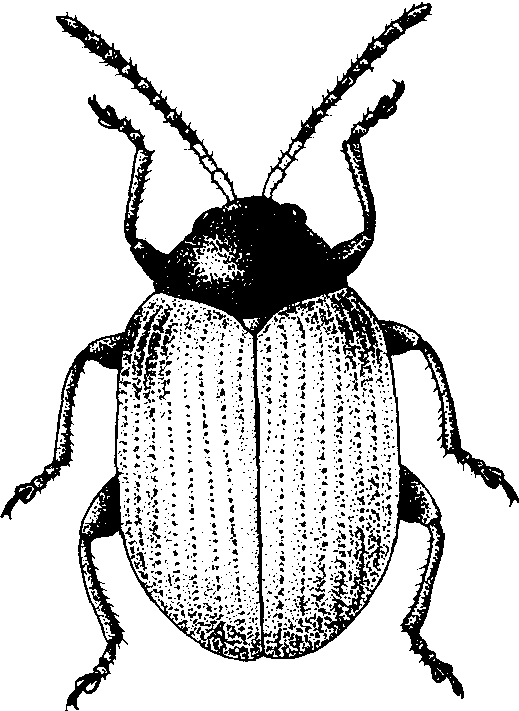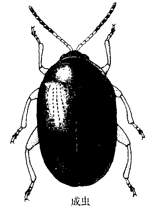 柑橘潜叶甲 学名Podagricomela nigricollisChen。分布于中国江苏、浙江、江西、湖北、湖南、四川、福建、广东和广西。在山地和近山果园发生较多,主要为害柑橘类植物的春梢。成虫在叶背取食叶肉,仅留叶面表皮呈透明斑块。幼虫潜叶蛀食成长形弯曲隧道,叶片萎黄脱落。成虫体长3~3.7毫米,呈卵圆形,头、前胸黑色。头部前缘有一深刻的弧形沟纹。后足股节膨大,中部最宽。鞘翅橘黄色,每鞘翅上有纵列刻点11行(图2)。末龄幼虫体长4.7~7毫米,深黄色,腹部各节前窄后宽呈梯形。南方柑橘区年发生1代。以成虫在柑橘树,或附近龙眼树和其他树木枝干翘皮裂缝或木栓层下,以及地衣、苔藓下和树干四周的松土中越夏、越冬。翌年3月下旬至4月越冬成虫外出为害和产卵,4~5月是幼虫为害时期,4月下旬至5月下旬化蛹,5月上旬至6月上旬羽化,此后成虫蛰伏越夏,继而越冬。成虫能飞善跳。卵散产于嫩叶背面或边缘,一生产卵300余粒,卵期4~11天。成虫寿命200多天。末龄幼虫随落叶坠地,不久脱出入土约3厘米深处作土室化蛹。防治方法是,清除成虫可能潜存的处所,及时扫集烧毁虫害落叶; 在越冬成虫出蛰活动期喷洒敌百虫、敌敌畏、亚胺硫磷、乐果等农药。
