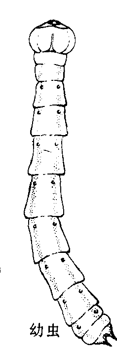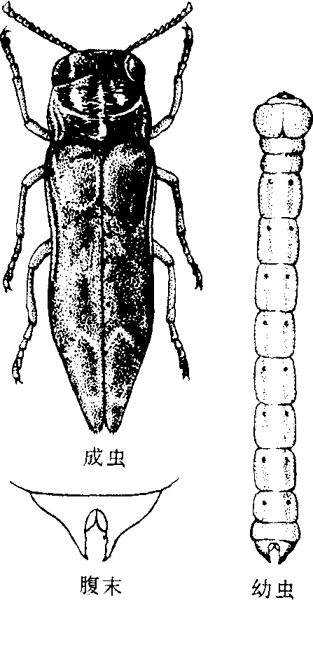 图 2 柑橘溜皮虫 六点吉丁虫 学名 Chrysobothris succedaneaSaunders。分布于中国广东、福建、湖南和浙江。成虫体长约11毫米,黑褐色,每一翅鞘上有3个金属青色圆斑。末龄幼虫体长18毫米,前胸宽大,较其他各体节大得多。前胸背板和腹板密生小刺突,背板具V形沟,腹板中央有一不完全的纵沟。腹部末端无坚硬的钳状突。幼虫为害状与柑橘爆皮虫相似,但虫道较粗短。 柑橘吉丁虫的防治方法是:❶冬、春成虫出洞前剪除虫害枯枝,砍除烧毁虫多枯死的橘树。 ❷用小刀削除枝干流胶处的初期幼虫,或用刀刮去流胶处一层薄皮,涂80%敌敌畏或20%亚胺硫磷乳剂加水(1:3),以触杀皮层内的幼虫。 ❸春季成虫出洞前,上一年虫害发生严重的树,用稻草从树干基部自下而上边搓边捆,紧密捆扎,并涂刷泥浆。可阻止成虫出洞和产卵,且有助树体伤口愈合。 ❹成虫发生期树冠喷洒敌敌畏,敌百虫,亚胺硫磷或乐果乳剂,或在树干涂药。 |