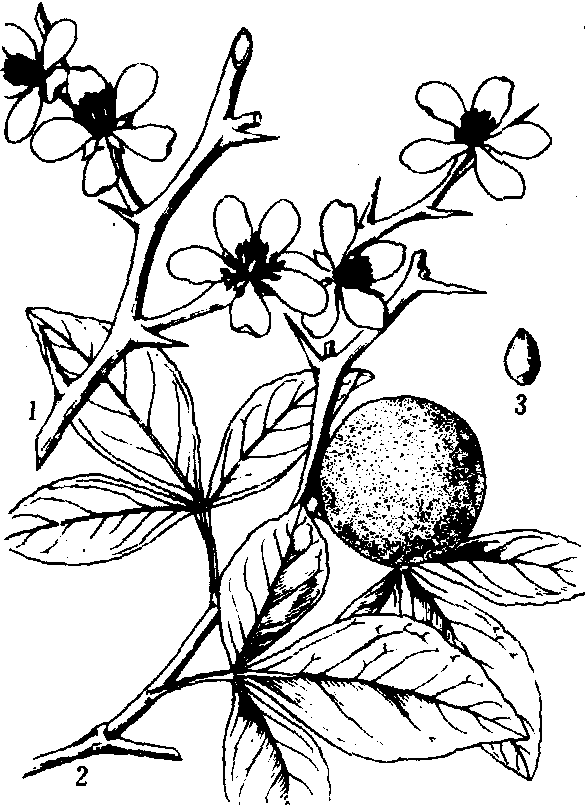 属间杂种比较重要的还有澳沙檬与酸橙的杂种沙酸橙(Eremoradia); 与甜橙的杂种沙甜橙(Eremora-nge);澳橘檬与金柑的杂种金橘檬(Faustrim)等。多样的种质使利用时增加了选择机会,但又带来了收集、保存的困难。柑橘植物的种子多具多胚性,多个珠心胚一个合子胚,而且珠心胚占优势,合子胚往往败育。因此, 不论是有性杂种或是体细胞突变而来的变异, 即使是通过种子繁殖也大多能保留下来。 主要柑橘种质资源 对柑橘属植物的分类参照曾勉的意见, 分为以下几类: 大翼橙类 中国有红河橙(C. hongheensis)、马蜂柑(C.hystrix DC.)、宜昌橙(C. ichangensis Swingle)等, 翼叶特大, 汁泡具芳香油点, 种子单胚。红河橙、宜昌橙为中国原产, 野生分布。这类柑橘有许多天然野生类型。有的已用作砧木,如香橙(C. junos(Sieb.)Tanaka)、菲律宾大翼橙(C. macrophylla Wester)是柠檬的砧木。 枸橼柠檬类 有枸橼(C. medica L.)、柠檬 (C.limon Burm.f.)、㰀檬 (C.limonia Osbeck)和来檬(C.aurantifolia Swingle)等。翼叶小或几不具翼叶,汁胞味酸, 除作酸果柑橘栽培外, 多用作砧木。一种起源于杂种的粗柠檬, 有强大根系, 耐旱, 抗衰退病等病毒病, 但容易感染根腐病和线虫, 在美国、阿根廷、澳大利亚、印度和南非广泛用于甜橙、葡萄柚和橘类的砧木。高产, 但果实品质差, 不适于作生产鲜果的砧木。檬在中国南方用作柑橘砧木。来檬有三倍体类型, 果实无核,是热带地区的主要酸果用柑橘;也可作酸橙或葡萄柚和橘柚的砧木, 其表现与粗柠檬相似。一种墨西哥来檬,可作为柑橘病毒的指示植物,将拟鉴定的柑橘枝条嫁接在它上边, 可以在较短期间内看出是否染有衰退病等病害。 柚类 有柚(C.grandis Osbeck)和葡萄柚(C.paradisii Macf.),柚原产中国, 葡萄柚有人认为是柚与甜橙的杂种。柚果特大, 种子单胚, 品种极多, 是很有潜力的种质资源。无酸类型的品种有沙田柚、梁平柚、垫江柚等。甘酸类型的品种有文旦、晚白柚。另产生有许多无核的类型。柚和葡萄柚作为柑橘砧木,都不理想。 橙类 中国原产有甜橙(C.sinensis Osbeck)和酸橙(C.aurantium L.), 甜橙是世界上主栽的柑橘种类, 各地长期栽培选择出许多品种和品系, 除普通甜橙外, 尚有果实无核的脐橙、果肉具红斑的血橙。普通甜橙在中国品种(系)很多, 无酸型的有新会橙、柳橙, 甘酸型的有锦橙、先锋橙, 以及从橘类嵌合体中选出的福建改良橙等。作为砧木,甜橙应用已不多,酸橙是世界上广泛使用的砧木。酸橙为深根性植物, 是甜橙、葡萄柚和橘的砧木, 果实品质优良, 缺点是不抗衰退病, 易受线虫为害。中国浙江的枸头橙是很有希望的抗衰退病砧木资源。 宽皮柑橘类 花单生, 皮可剥离,种子胚绿色,有异于以上各类。为中国原产, 品种极多, 是宽皮柑橘类的宝库。椪柑(C.reticulata Blanco)以中国为中心,西至伊拉克, 东到菲律宾, 广泛栽培。红橘 (C.tan-gerina Hort.ex Tanaka)是四川和福建的主栽品种。乳橘(C.kinokuni Hort.ex Tanaka)果小、味甜、少核, 是江西、浙江等地的主要品种。天然杂种很多,如温州蜜柑(C.unshiu Marc.), 果实无核, 丰产,味佳,在中国和日本普遍栽培。蕉柑(C.tankan Hayata),广东、广西南部普遍栽培。克里曼丁 (C. clementinaHort.)是地中海地区主栽的柑橘, 广泛利用其作杂交亲本。宽皮橘类作为砧木在中国应用较广。红橘、土柑、香柑和建柑在四川都是甜橙较好的砧木。美洲用Cleoptra为砧木, 嫁接橘、橘柚和葡萄柚, 在佛罗里达州表现良好。在巴西则用酸橘为甜橙的良好砧木。 柑橘属近缘植物 主要指芸香科柑橘亚科柑橘族柑橘亚族真正柑橘果树组植物中除柑橘属以外的5属植物。这些近缘属植物中, 除百蕊橘属外, 已进行利用和评价的有: 金柑属 中国原产, 约6种,1变种。有种子单胚种和多胚种, 发现有自然四倍体资源。果小,皮可食,一年开花多次, 耐寒, 童期较柑橘属短, 实生苗对土壤缺铜较敏感。是具明显休眠期和果皮油性状的种质。 枳属 原产中国, 为落叶树,极耐寒,能耐—26℃低温, 抗柑橘线虫病, 流胶病和衰退病, 但不抗裂皮病并对高氯及石灰过量的土壤敏感, 是世界重要的砧木之一(见图)。已选出了许多已命名的砧木无性系。日本已选育出30个以上的枳无性系, 可分为大花型和小花型两类, 各无性系间没有很大差异。中国枳的变异类型和天然杂种资源极丰富。枳橙砧在很多地区已经取代了酸橙砧, 许多选择系已命名, 在不同地区对不同接穗品种的表现各异。除枳橙外, 枳还有许多与其他柑橘类的杂交种。与橘的杂种(Citrandarin),与酸橙的杂种, 与柠檬的杂种(Citremons), 与甜橙的杂种(Citranges),与金柑的杂种(Citrangeguats)等。曾用它们中的选择系试作柑橘类的砧木, 只有与葡萄柚杂交的枳柚(Citrumelos)能用于经济生产, 其余均不如枳橙有希望。 1. 花枝; 2. 果枝; 3. 种子 澳沙檬属 原产于澳大利亚东部米干县地区, 童期长达10年以上, 本属是抗寒, 极早熟, 有明显休眠期的种质资源。澳沙檬属植物很容易和柑橘属植物杂交,但它与柑橘属植物间的嫁接亲和力很差;它们间的杂种与柑橘却能够嫁接成活,有希望作为砧木资源。 澳橘檬 原产于澳大利亚东部雨林地带及新几内亚。是常绿小灌木。汁泡味极酸, 离生, 不耐寒, 某些品系抗蚊孔线虫和流胶病、童期短。如巴布亚澳指檬(M.papuana), 在温室条件下一年生的实生苗就能开花结果。 美国的研究表明, 樱桃橘属(Citropsis)、柑果子属(Hes