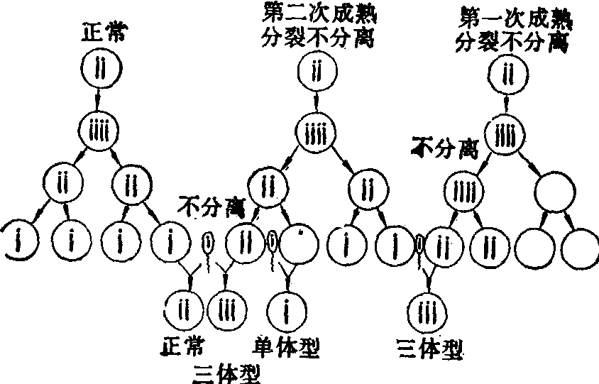 图2 多体型形成机制 图3 “不分离”形成嵌合体机制 染色体丢失(或称后期迟滞)是产生非整倍体的另一可能原因,即在细胞分裂后期,染色体向两极移动时,有一个染色体行动迟缓,以致在末期子细胞形成核膜时,这个染色体留在细胞质中而逐渐消失。这种机制虽然在人类尚未能证实,但可能是性染色体数目变化及形成嵌合体的重要原因,可以解释X/XY,X/XX,XY/XXY等嵌合体的形成。有证据表明,被丢失染色体本身的异常可能是造成丢失的原因。 ![]() 图4 “丢失”形成嵌合体的机制 染色体结构异常主要由于外因 (电离辐射、化学畸变剂、病毒感染等)或体内某些因素影响下,染色体发生断裂和重接。由于断裂的次数、位置以及参与重接 (或重排)的染色体不同,可表现为各种类型。常见的为: (1)缺失: 一处断裂,无着丝粒节段在胞质中消失(末端缺失);两处断裂,中间节段消失(中间缺失)。 (2) 倒位: 两处断裂,中间节段倒转后重接。两断裂处同在长臂或短臂称臂内倒位; 断裂分别发生于长臂和短臂一处,称臂间倒位。 (3) 重复: 染色体某节段重复出现。如果重复节段与原节段方向一致称正位重复,反之称倒位重复。广义而言,多倍体和多体型都可看成是重复。 (4) 易位: 染色体某处发生断裂后,断片离开原来位置转移到另一位置上重新连接。由于重新连接的部位和方式不同又可分为: ❶转移,即断片易位到同一染色体的另一部位; ❷单方易位,即断片易位到另一染色体上; ❸相互易位,即两个染色体的断片互换位置,如果两条带有着丝粒的节段相互连接,形成一个带有两个着丝粒的衍生染色体,称为双着丝粒染色体; ❹罗式易位又称着丝粒融合,即在两个近端着丝粒染色体的着丝粒发生断裂,两长臂端连接成一新的衍生染色体,短臂连接成的一小染色体,随后消失; ❺插入易位,即染色体断片插入到非同源染色体的非末端部位,按插入顺序可分为正位插入与倒位插入两种; ❻串联易位,即一般在两条近端着丝粒染色体的两个不同部位(一在长臂末端,一在长臂近着丝粒处)断裂,无着丝粒长臂断片连接在有着丝粒节段末端串联成一条长的衍生染色体; ❼复合易位,即三条以上的染色体相互交换其节段。 (5) 环状染色体:一条染色体长臂及短臂末端处断裂,断端连结形成环状。如果一臂断裂形成无着丝粒环状染色体则易在细胞中消失。 (6) 等臂染色体:两同源染色体均在着丝粒处横断,或一条染色体于复制前后在着丝粒处横断,短臂或长臂可各自互相连结,形成两臂等长的染色体,两短臂形成的等臂染色体后来多在细胞中消失。 染色体病对机体的影响和临床表现,取决于遗传物质增减的多少、变化的性质以及涉及哪些染色体。遗传物质的丢失多见于单体型、缺失、某些易位、环状染色体、双着丝粒染色体等。遗传物质丢失的多少与病情轻重之间有一定的关系。丢失部分较大或影响较严重时,可以相当于整条染色体丢失的效应。例如X染色体长臂缺失(XXq-)或短臂缺失 (XXp-)、环状X染色体 (XXr)等都可产生X单体型 (Turner综合征)相似症状,而XXp-甚至可出现Turner综合征的全部临床表现。遗传物质的增加见于多倍体、多体型以及重复、插入等结构变异。多倍体以及多体型由于对遗传平衡的干扰太大而多不能存活,仅少数三体型可生存,但有严重的发育缺陷,难以活至成年。重复或插入的后果与三体型或部分三体型相似。遗传物质仅有位置改变而无增减者见于倒位、相互易位等。此时可不表现临床症状。不表现临床症状的易位称为平衡易位。但该类细胞在进行减数分裂联会时对配对有影响,可产生异常精子或卵子,影响后代。 染色体病的临床表现多种多样,但以胚胎发育障碍形成的先天畸形为主。一般较单基因病或多基因病严重。常染色体数目或结构异常多表现为畸形面容(如小头、低位耳、斜眼、小眼、内眦赘皮、斜视、眼距变异、鼻梁宽、高颧、颌小、唇裂和腭裂、颈短、颈蹼等)、内脏畸形(先天性心脏病、肾畸形等)、躯体发育障碍(体重轻、身材矮小、脊柱发育缺陷)以及智能发育不全。其次,也可有性腺、外生殖器及第二性征发育障碍。性染色体异常则主要表现为性腺不发育,卵巢或睾丸小,呈条索状,闭经或无精子生成,外生殖器发育迟缓、不发育或异常(如两性畸形)。在各种染色体异常中,凡具有Y染色体者表现型为男性,无Y染色体仅有X染色体者为女性。嵌合体XX/XY为真两性畸形,患者同时具有卵巢和睾丸,外生殖器亦呈两性特征(可主要为一种性别,或性别难辨)。真性两性畸形的形成可能是双卵受精的结果,也可能是单卵卵裂后双受精形成(精子为X和Y两种)。在女性,仅有一个X染色体 (Turner综合征)时,主要表现为卵巢纤维化,无月经,生殖器官呈幼稚型,并可有某些畸形面容。XXX(超雌)外表大致正常,可有某些精神障碍,智力稍差,约3/4病例月经正常,甚至可有生育能力。其他多X综合征则表现为X染色体越多,智力越差。在男性,只有Y染色体不能存活,必须伴有一个X染色体。X染色体如果增加,如XXY (Klinefelter综合征)表现为睾丸细精管发育不全,睾丸小而硬,不育,身材高,躯体和智力发育大致正常。又如XYY综合征,患者具有身材高大,性情凶暴,有攻击行为以及智力缺损等特点,但生育力可保存。其他多Y综合征都有生殖功能障碍、智能发育不全等特点。 染色体数目和结构异常与临床表现之间有时表现出一