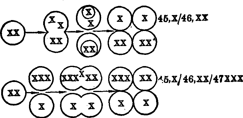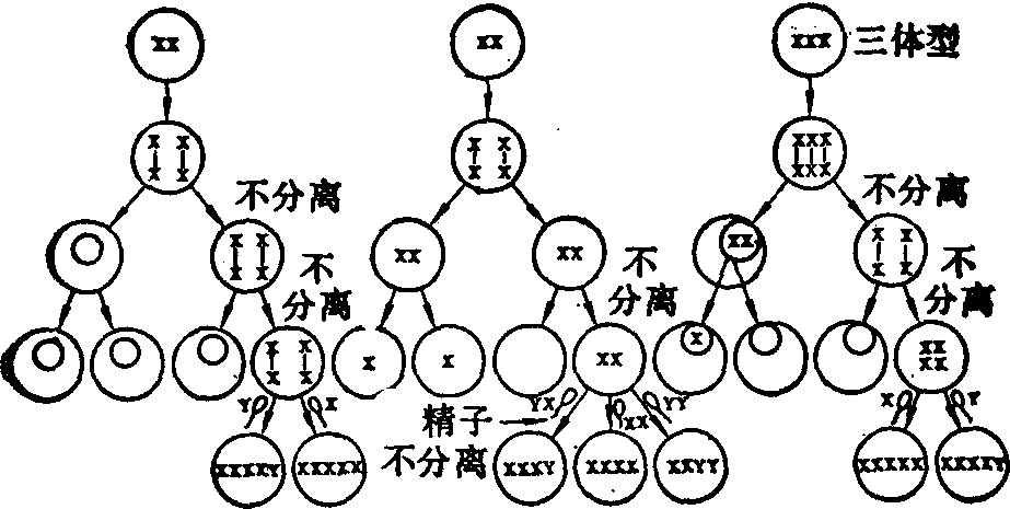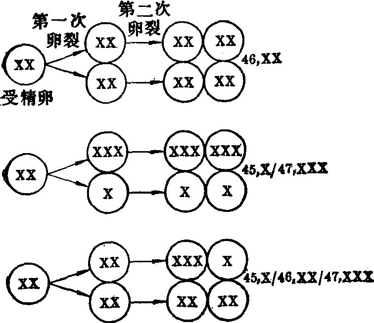 * 培养标本总数1406份,培养成功标本788份,其中153份异常(占总数的19%)(引自:Geneva conference,1966)** 人类染色体按国际Genever会议,分为七组,依次命名为A,B,C,D,E,F,G组。分组的依据主要是染色体的长短和着丝粒的位置。A组为1~3对,B组4~5对,C组6~12对,D组13~15对,E组16~18对,F组19~20对,G组21~22对。性染色体X和Y不分组,依其形态,X属C组,Y属G组。 染色体数目异常包括多倍体(3n,4n等)及非整倍体(单体型、三体型、四体型、五体型、六体型等)。常染色体和性染色体数目都可有改变,兼有常染色体和性染色体数目变化者偶见。三体型和单体型(主要为45,X)较多见。 人类多倍体不能存活,故仅在自发流产儿中见到。三倍体能活至临产或出生者,已报告有数十例。Polani(1969)统计的31例中,69,XXY 20例;69,XXX 9例;69,XYY 2例。而且多数为嵌合体。四倍体仅见过1例嵌合体 (4n/2n)。 三倍体的发生机制有两种可能:一是双雄受精,即两个精子同时进入一个成熟卵子受精;另一是双雌受精,即在减数分裂中,卵细胞因某种原因未能形成极体,因而卵子中保留二组染色体,受精后形成三倍体。上述两种机制中后一种可能性较大。 三体型可分常染色体三体型和性染色体三体型。常染色体三体型以13-三体型 (Patau综合征)、18-三体型(Edward综合征)、21-三体型 (先天愚型,Down综合征)最为常见,发生率分别为0.01%、0.01%和0.1%。性染色体三体型有XXX (超雌)、XXY (Klinefelter综合征)及XYY综合征三种,发生率分别为0.09~0.1%(女性)、0.1%(男性)及0.08~0.09%(男性)。三体型中还可分出一些亚型,称为部分三体型,其特点是额外的染色体不完整(缺失)。 单体型主要见于性染色体,即Turner综合征 (45,X)。新生儿中发生率为0.09~0.13%。据估计,45,X实际发生率远比此值为高,大多数45,X在胚胎期即已死亡。常染色体单体型一般不能存活,仅报告过少数21-单体型病例(反先天愚型)。X单体型部分能幸存的原因可能是机体仅需一个X染色体上的基因即能存活(Lyon假说)。而常染色体只有含遗传物质较少的(G组),对生命活动影响较少(遗传上不活跃)的个别染色体(如21号)可出现存活的单体型。 三体型以上的多体型只见于性染色体。女性有48,XXXX; 49,XXXXX等类型。男性有48,XXXY; 48,XXYY; 49,XXXYY; 49,XXXXY等类型。曾见数例双三体型 (47,XXX/47,XX,+18)。 上述各种染色体数目异常都可以镶嵌状态存在。即一个体同时具有两种以上不同核型的细胞系(株)。不同细胞系如果来源于同一受精卵称为同源嵌合体,简称嵌合体; 来源于不同受精卵所形成的镶嵌状态称为异源嵌合体。嵌合体可有多种形式。 非整倍体的发生机制还不完全清楚。一般认为可以用染色体不分离和染色体丢失两种机制来解释。精原细胞和卵原细胞经过若干次有丝分裂后产生初级精母细胞和初级卵母细胞,再经过两次成熟分裂(减数分裂)生成精子和卵子。每次细胞分裂都有同对染色体(或染色单体)分离,分别进入子细胞中。如果同对染色体(或单体)因某种原因不分离而进入子细胞,则形成子细胞染色体数为n+1和n-1。如果不分离发生在减数分裂时,则产生n+1和n-1两种卵子或精子,受精卵即形成单体型或三体型的个体。如果亲代细胞原来都是二倍体,此时发生的不分离称为初级不分离; 如果亲代生殖细胞已经是三体型(或多体型),则在减数分裂时必然有额外染色体进入精子或卵子中,这种不分离称为次级不分离或不可避免性不分离。不分离发生的时间与后果有很大关系。如果发生在合子(受精卵)形成前各时期,称为合子前期不分离。根据形态学观察和遗传学检测得知,来自母体的不分离占多数。不分离机制也是产生多体型的原因。多体型可以发生在下列情况: ❶初级精母或卵母细胞于两次成熟分裂时,连续出现不分离现象,以致生成n+2或n+3的精子或卵子; ❷精子和卵子生成过程中都出现不分离; ❸父母一方本身为多体型个体以致产生各种类型的次级不分离配子。不分离发生在合子形成后卵裂时期,称合子后期不分离。第一次卵裂发生不分离,则产生两个非整倍体细胞系,即n+1和n-1细胞系。第二次卵裂时,如一个细胞发生不分离,则形成三种细胞系,即2n,2n+1,2n-1。如2n-1缺少的为常染色体,细胞不能存活,剩下的2n+1细胞系与正常细胞构成双重嵌合体(2n/2n+1); 若缺少的染色体为性染色体X,则可形成三重嵌合体(X/XX/XXX)。各细胞系数量的多少可能与发生不分离的时间有关,如发生在卵裂后期,则正常细胞系比例增大。至于染色体不分离的原因尚未阐明。过去认为与母龄有关,因为从21-三体型的观察中看到,母龄越大,产生21-三体型的频率越高。解释是,母龄越大,卵子在母体内停留时间越长,在母体各种因素影响下日益老化,较易发生不分离现象。但也有约40%的21-三体型与母龄无关。这部分病例的不分离可能与以下因素有关: ❶环境因素(电离辐射和病毒感染); ❷遗传因素(不分离存在遗传倾向); ❸次级不分离; ❹不平衡易位。近期研究认为,不分离多发生在近端着丝粒染色体,而这类染色体核仁组织区的集结和核仁融合可能是不分离的重要原因。 表2 嵌合体的各种形式举例