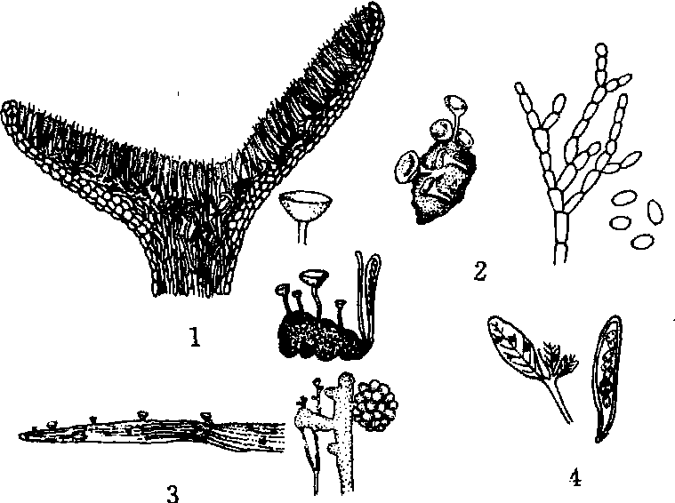 该目绝大多数腐生于土壤、粪便、烂真菌或朽木上,也有重要的植物病原真菌,寄生高等植物各部分,引起烂叶、烂花、烂果等局部性侵染病害,分布亚热带或温带。除导致植物病害外,该目真菌可形成有益的外生菌根或提供杀菌剂抗性测定的敏感菌。 该目原是南费尔特(John Axel Nannfeldt) 1932年建立的,分成皮盘菌科等6个科。丹尼斯(RichardWilliam George Dennis) 1968年转移星裂菌科另组成该目。科夫(Richard Paul Korf) 1973年基本接受了丹尼斯对该目的分科意见。该目现分8科,225属,约1750种。重要的病原菌科有核盘菌科(Sclerotiniaceae)和皮盘菌科(Dermateaceae)。重要病原属有: 核盘菌属,链核盘菌属,葡萄孢盘菌属,假盘菌属等(见图)。 核盘菌属(Sclerotinia Fuck.)在寄主表面或组织内形成菌核,菌核萌发产生子囊盘,子囊盘杯状或盘状,褐色。子囊孢子单胞,无色,椭圆形,不产生分生孢子阶段。常见种核盘菌[S.sclerotiorum (Lib.) deBary]世界性分布,引起多种植物幼苗猝倒和软腐。 链核盘菌属(Monilinia Honey),子囊盘从假菌核生出,漏斗形或盘形,淡紫褐色。子囊孢子单胞,无色,椭圆形。无性态为丛梗孢属(Monilia)。常见种是核果链核盘菌,引起桃、李等核果类褐腐病[M.laxa(Aderh et Ruhl.) Honey]。 葡萄孢盘菌属(Botryotinia Whetzel)在寄主的角质层或表皮下形成圆形的菌核,从菌核抽出子囊盘。子囊盘杯状至盘形,褐色。子囊孢子单胞,无色,椭圆形。无性态为葡萄孢属(Botrytis)。常见种有富氏葡萄孢盘菌[B.fuckeliana (de Bary) Whetzel]为害多种仁果类和核果类果实,引起腐烂病。 假盘菌属(Pseudopeziza Fuck.),子囊盘产生在表皮下的子座上,成熟后突破表皮外露,浅色,基部有发达的囊盘被,侧面无囊盘被。子囊孢子单细胞,无色,椭圆形。侧丝粗短,无色。寄生真菌,引起植物的叶斑病。无性态缺乏或为炭疽菌属(Colletotrichum)或盘二孢属(Marssonina)。常见种如苜蓿假盘菌[P.medicaginis (Lib.) Sacc.],为害苜蓿的叶片,叶柄和茎部,引起苜蓿褐斑病。 柔膜菌目Helotiales子囊菌亚门,盘菌纲。菌丝有隔膜,菌丝体繁茂,淡色至褐色。有性生殖时产生的子囊盘表生或埋生在寄主组织内,或从菌核、假菌核上生出,杯状至盘状,肉质、软骨质或革质,淡色或暗色,有或无柄,囊盘被厚或不发达,囊层基大部分组织呈菌丝状或拟薄壁组织状。子囊多个,圆筒形或棍棒形,与侧丝并列形成子实层,早期外露或在子囊和子囊孢子成熟前外露,子囊壁单层,两侧壁薄,顶壁稍厚,有顶孔。子囊孢子8个,卵圆形、椭圆形或纺锤形,单胞、双胞或多胞,无色至褐色。无性态为葡萄孢属(Botrytis)和丛梗孢属(Monilia)等,有些种类无性态未见。陆生,腐生或寄生,营寄生的种类引致花腐、果腐、灰霉和叶斑等症状。本目有核盘菌科和皮盘菌科等8科,含核盘菌属、链核盘菌属和双壳属等200余属。 |