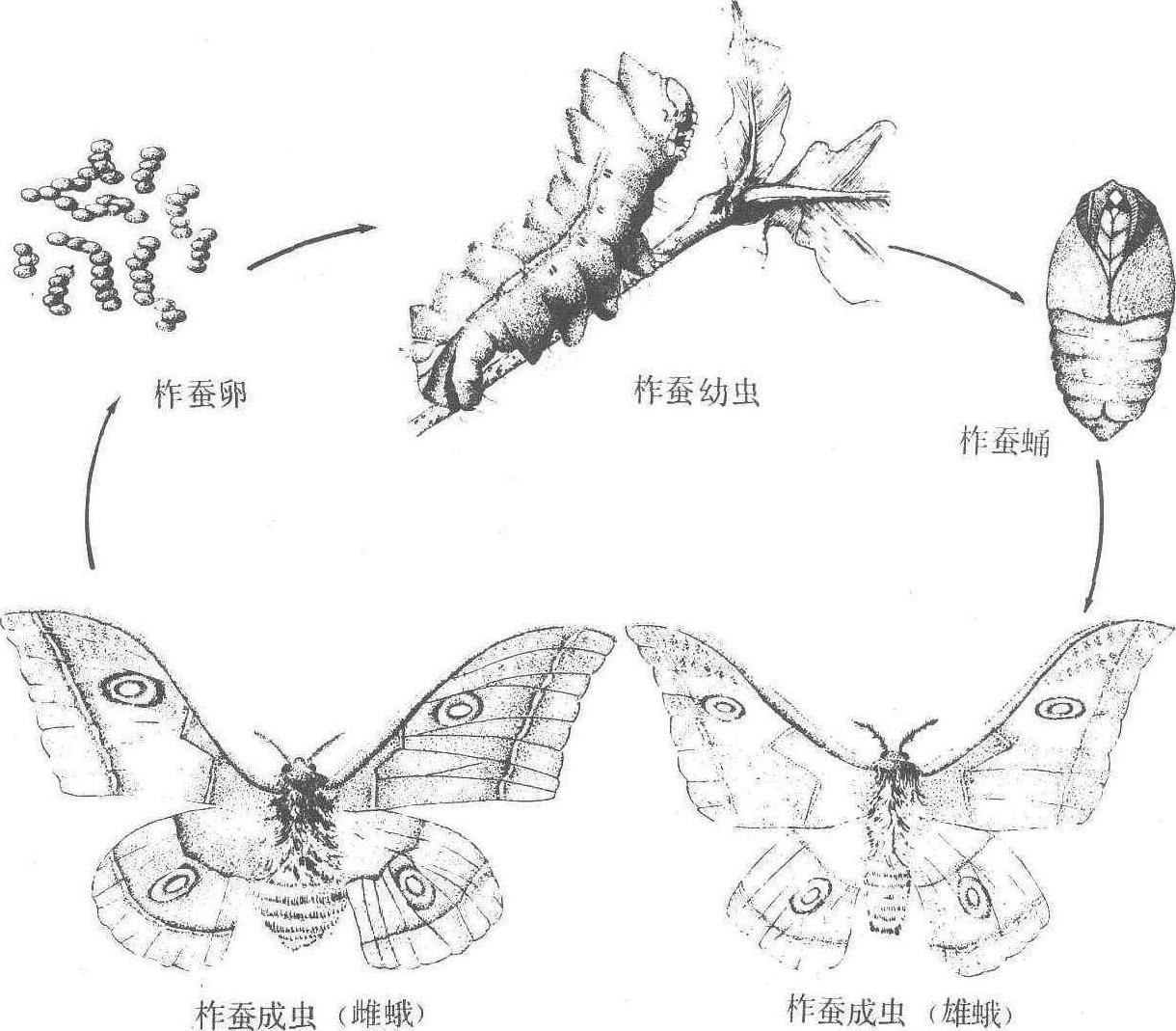 释义 | 柞蚕zuòcán〈名〉一种昆虫,比家蚕大,将变成蛹的幼虫全身长有褐色长毛,吃栎树的叶子,吐的丝是丝织品的重要原料:柞蚕丝。 古代名物 > 蟲豸類 > 昆蟲部 > 蛾蝶 > 柞蠶 柞蠶 zuòcán 野蠶的一種。幼蟲緑、黄或天藍等色,成蟲全體有黄褐色鱗毛,四翅各有一白斑紋及斜條紋。以食柞樹之葉而名。《太平御覽》卷八百二十五引《廣志》:“有柞蠶,食柞葉,可以作綿。”參見本類“野蠶”。 蚕 蚕蚕(蚕妇;蚕姬;~丝;~蛹;~沙;家~;桑蚕;柞~;梓~;蓖麻~) 蟓 龙精 女儿 神虫 螝蛾 马首 含丝虫 马头娘 另见:丝 丝织物 ☚ 益虫 害虫 ☛ 柞蚕Chinese tussah silkworm以柞树叶为食料的吐丝结茧昆虫。属鳞翅目、大蚕蛾科,学名为Antheraea pernyi Guenrin-Meneville。柞蚕原产中国,是由古代栖息在山坡柞树上的一种野蚕,经过长期驯化饲养而来。因此,又称野蚕或山蚕。柞蚕属于温带型经济昆虫,其生活适温范围为8~30℃,生长发育的适温范围为11~25℃,最适宜温度范围为22~24℃。主要分布于中国,在朝鲜、苏联、印度和日本等国亦有少量分布。 柞蚕的一生 柞蚕是完全变态昆虫,一生中要经过卵、幼虫、蛹、成虫4个形态和生理功能完全不同的发育阶段。其中卵是柞蚕的胚胎发育形成幼虫的阶段;幼虫是柞蚕唯一摄取食物,积累营养物质,并完成丝的合成及吐丝结茧的生长阶段;蛹是幼虫向成虫变态的过渡阶段,通过蛹的滞育渡过寒冷的冬季;成虫是进行交配、产卵、繁衍后代的生殖阶段(见图)。 柞蚕以壳斗科栎属植物如尖柞、蒙古柞、槲等的叶片为饲料。此外,也能取食蒿柳、山定子、栗、枫、梨、苹果等少数植物的叶片,但须在蚁蚕时就开始饲喂,如饲育中改喂这些饲料,柞蚕将拒食或厌食。小蚕喜食嫩叶,大蚕喜食适熟叶。1头蚕从孵化到结茧,春蚕期约50~54天,食叶30~35克左右,秋蚕期约46~50天,食叶50~55克。其中大蚕的食下量约占食下总量的80%以上,5龄蚕最大。春蚕期体重达14克左右,秋蚕期21克左右,分别是蚁蚕体重的2,000和3,000倍。在正常情况下,柞蚕幼虫需经4次眠和蜕皮,每蜕皮一次,递增1龄,至5龄老熟吐丝结茧。 在自然条件下,分布在不同纬度的柞蚕,由于受光照等因素的影响,有1化和2化区别,即一年内完成1个世代和2个世代。中国东北地区的柞蚕,均属于2化性,山东以南为1化性。不同化性的柞蚕生活世代见下表。 柞蚕又根据化性、体色、习性、茧形、丝量等特征特性,在群体中分为许多品种,各品种多以体色、产地、化性、育种编号及某一特殊的经济性状等进行命名。辽宁蚕区生产上应用的主要柞蚕品种有青黄一号、青六号、柞早一号、辽柞一号及三里丝等;山东省应用的主要柞蚕品种有黄安东、胶兰、鲁青等;河南省应用的主要柞蚕品种有三三、三九等。此外,各个蚕区还选配了一批柞蚕杂交种,应用于丝茧生产(见柞蚕品种)。 柞蚕幼虫老熟后开始吐丝结茧,这是柞蚕生存适应环境的一种本能行为,幼虫在茧内化蛹并发生滞育或不滞育,在茧壳的保护下安全越冬,继续繁衍后代。 2化柞蚕(辽宁)与1化柞蚕(河南)生活世代表