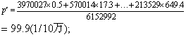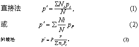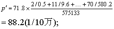 (1)直接法。按式(1),以表3第(2)栏Ni和表2第(5)栏p1各对应数据以及表3第(2)栏的合计N代入,得甲县的标准化率为 仿此,乙县为 p′= 85.2(1/10万)。 或按式(2),以表3第(3)栏(Ni/N)和表2第(5)栏pi各对应数据代入,得甲县的标准化率为 p′=0.6452×0.5+0.0926×17.3+…+0.0347×649.4=99.9(1/10万); 仿此,乙县为 p′=85.2(1/10万)。 按式(1)与式(2)计算结果相同。 (2)间接法。按式(3),以表2第(2)栏ni和表3第(5)栏Pi各对应数据以及表2第(4)栏的合计r、表3第(5)栏的合计P代入,得甲县的标化率为 仿此,乙县为 p′= 85.1(1/10万)。 (3)反推法。按式(4),以表2第(4)栏ri和表3第(5)栏Pi各对应数据以及表2第(2)栏的合计n、表3第(5)栏的合计P代入,得甲县的标准化率为 仿此,乙县为 p′=61.3(1/10万)。 三种方法所得标化死亡率(1/10万)的数值不等,分析结论则一致: 甲县比乙县高。