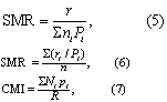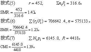 标准化死亡比和标准化死亡指数 标准化死亡比(SMR)和标准化死亡指数(CMI)的计算公式如下: 式中符号的涵意均同表1。在式(5)中,r为某特殊人群(或单位)的死亡人数,∑niPi为按某特殊人群(或单位)的各年龄组人口数与标准人群的年龄别死亡率乘积之和估计的预期死亡人数。标准人群一般选择该特殊人群所在地区同时间的、数量较大的人群。当SMR>1,表示被研究人群的死亡频度高于当地一般人群; 反之,SMR<1,表示被研究人群的死亡频度低于当地一般人群。式(6)是其反推法,不甚精确。式(7)中∑NiPi为按标准人群的各年龄组人口数与某特殊人群(或单位)的年龄别死亡率乘积之和估计的预期死亡人数,而R为标准人群的死亡人数。必要时可作假设检验,见条目“标准化死亡比的假设检验”。 例2 以例1甲县为特殊人群,试计算其食管癌死亡的SMR和CMI。 仍以表3资料为标准人群, 结果均表明甲县因食管癌死亡的频度高于当地一般人群。 ☚ 统计图 动态数列 ☛ |