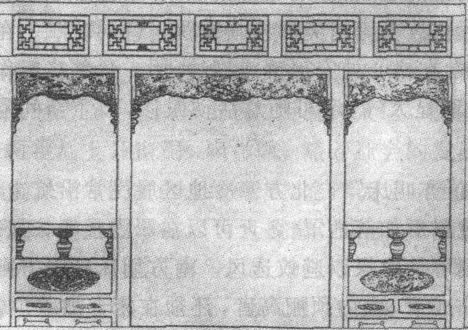 主要用于进深较大的房间,以之为室内隔断。形制是将开间进深部分分成三段,以两根立柱作间隔,中间一段较宽以便出入。罩顶类似于几腿罩(参见“几腿罩”条),左右段下部做重台栏杆,并于其上做精细雕刻,富于园林意味。