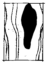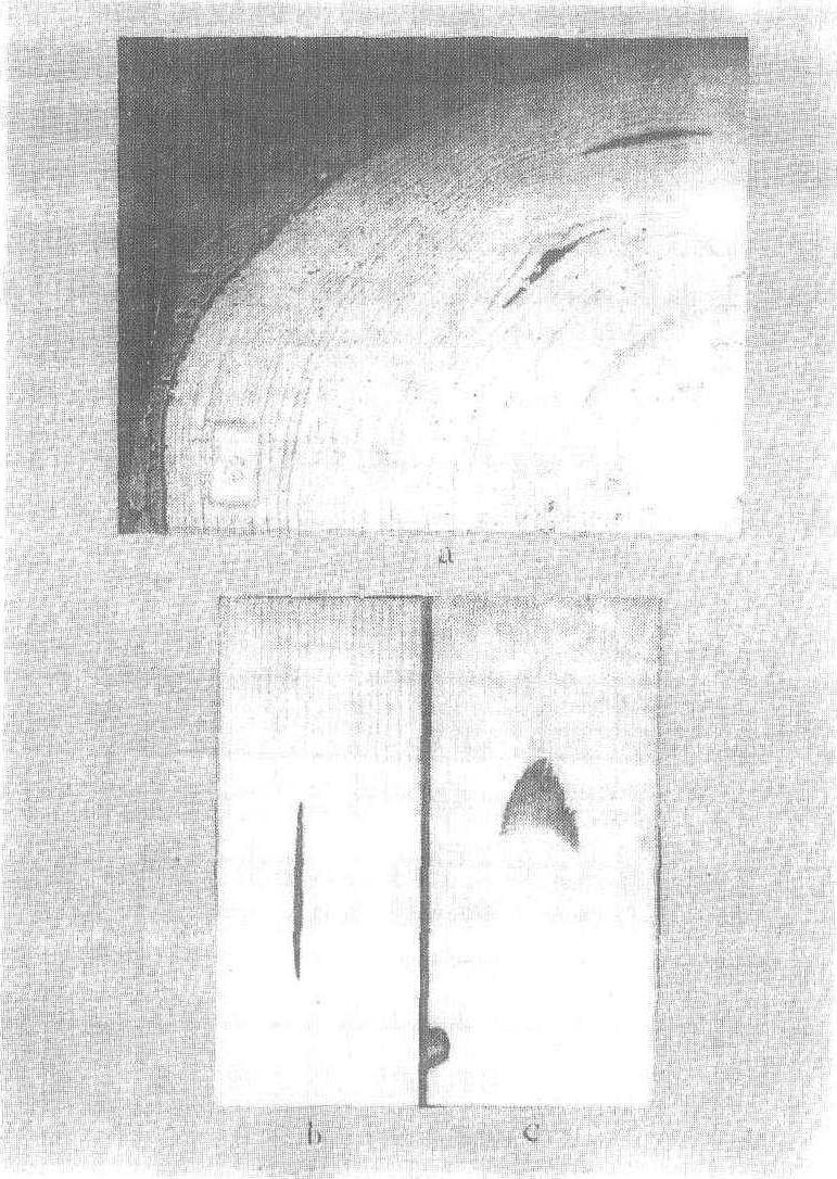 树脂囊图 a.木材横截面上的树脂囊;b.径切面上的树脂囊; c.弦切面上的树脂囊 树材,其形成层受到损伤而导致树脂聚集在生长轮之间,形成的一种面向髓心的半凸镜状腔槽。俗称油眼。在木材横切面上树脂囊呈短环形裂纹(图a),径切面则表现为顺木纹的缝隙,而在弦切面上表现为与木纹平行的卵圆或椭圆形斑块(图b、c)。当树脂大量聚集并渗透其周围的木质部从而形成颜色较正常材深的部分,称为树脂漏。通常较小的树脂囊并不影响木材的强度,树脂漏则使木材密度增高,冲击韧性、抗弯和抗压强度略降低,还会影响木材的油漆和胶粘效果,或因树脂流出而污染制品或构件的表面。树脂囊通常包含有液态或固态的树脂,也可能无内含物。树脂囊的大小变化很大,径向直径一般小于1.3厘米,沿木材生长层可延伸至十余厘米,顺纹理也可以很长。从显微镜观察,在树脂囊沟槽的表面覆盖着类似树脂道的分泌薄壁组织。是否形成层分泌薄壁组织,是由于天然作用在短时期中产生分泌细胞层而不分生管胞;或是由于风的作用引起形成层和分泌细胞层的破坏,而形成破坏的表面,至今尚无定论。树脂囊resin pocket木材年轮中充满树脂的条状沟槽。它仅存在于部分具有树脂道的针叶树材中,如云杉、松树、北美黄杉、落叶松等。当它们在生长过程中表面受到损伤,使形成层受到伤害后在木材中的局部树脂过量聚集,在年轮之间形成一种充填树脂,即树脂囊,生产上称为油眼。油眼在原木的横截面上是充满树脂的弧形裂纹,在径切面上呈短小的缝隙,而在弦切面上则为充满树脂的椭圆形或掌形浅沟。较小的油眼并不影响木材的强度,但往往会因树脂溢出而污染木制品的表面,因而也是木材的一种缺陷。