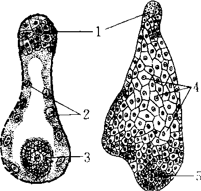 释义 | 核型胚乳nuclear endosperm胚乳发育过程中,具游离核时期的一种胚乳发育类型。初生胚乳核分裂的早期阶段不伴随细胞质的分裂,从而形成许多游离核。待发育到一定阶段时,才进行细胞质分裂,形成细胞壁。游离核时期的长短因植物种类不同而异。多数植物形成数百个至数千个游离核后才形成细胞壁。有的植物只经几次分裂,便产生细胞壁,如咖啡产生4个游离核后就进行细胞质分裂;但也有少数植物的胚乳始终保持游离核的状态,如旱金莲属等。胚乳游离核分化形成胚乳细胞的顺序,一般由珠孔端向合点端,由外层向心逐渐进行,少数植物由合点端开始或同时由珠孔端与合点端相对进行。多数双子叶离瓣花植物和单子叶植物胚乳的发育属于核型,如小麦、水稻、棉花、油菜等。 玉米的核型胚乳 1.反足细胞 2. 胚乳细胞核 3. 合子 4. 胚乳 5. 胚 |