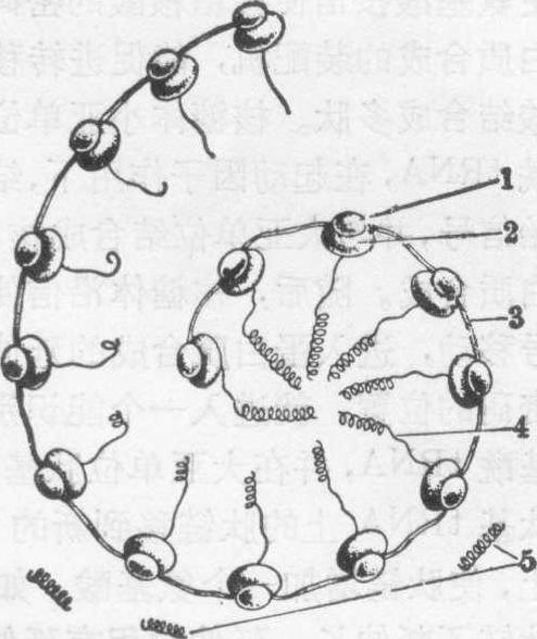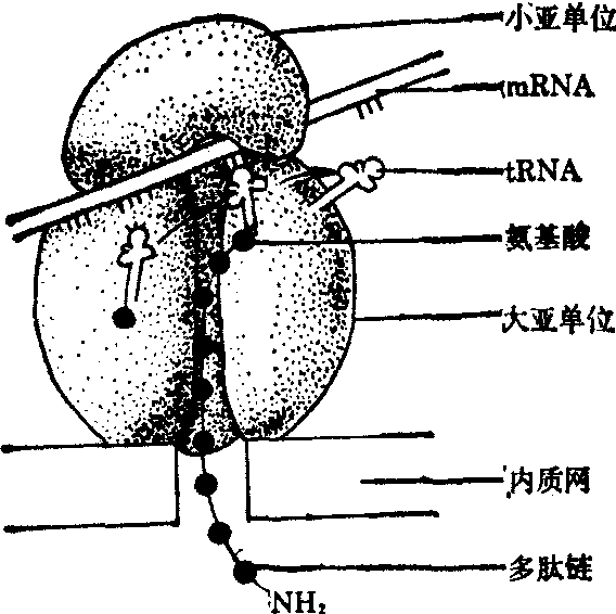 * 因种类而异。 细胞内核糖体的数量和分布由蛋白质合成的旺盛程度决定。合成旺盛的细胞,核糖体多,否则较少;同一细胞内蛋白质合成旺盛区域的核糖体也较多。真核细胞的线粒体和叶绿体也有各自的核糖体,可合成部分蛋白质(见线粒体、叶绿体)。 化学组成 蛋白质约占60%,rRNA约占40%。原核细胞核糖体小亚基含有16S rRNA和21种蛋白质;大亚基含有23S rRNA、5SrRNA和34种蛋白质。真核细胞核糖体小亚基含有18S rRNA和34种蛋白质(物种间有较大差异); 大亚基含有28S rRNA(植物为25S rRNA)、5S rRNA (有些真核细胞的大亚基尚有5.5S、5.8 S或7S rRNA)以及39种蛋白质。核糖体还含有少量多胺,如尸胺、四甲烯二胺、亚精胺及Mg2+、Ca2+、Cr3+、Mn3+、Ni3+、Fe3+等离子。目前除已知亚精胺、Mg2+离子有促进核糖体亚基的聚合作用外,其他物质的作用尚不十分清楚。 存在状态 在细胞中与膜结合时称附着核糖体,游离存在时称游离核糖体。真核细胞的附着核糖体主要结合在粗面内质网上,合成的蛋白质多数是分泌蛋白和膜结合蛋白。游离核糖体一般 为被“锚锭”在微梁网络上,主要合成细胞本身生长、繁殖所需要的蛋白质,如结构蛋白、基质蛋白和酶蛋白等,故在未分化细胞和肿瘤细胞中数量较多。但也有例外情况,如大鼠肝细胞的输出蛋白中85%由附着核糖体合成,15%由游离核糖体合成。原核细胞缺内膜系统,其附着核糖体结合于质膜内表面。 核糖体与蛋白质合成 在蛋白质合成过程中,小亚基在起始因子的参与下和mRNA结合,形成小亚基与mRNA的复合体;接着蛋氨酰tRNA 的反密码子与mRNA的起始密码结合,大亚基再结合上去,这时蛋氨酰tRNA处于核糖体的P部位,而A部位处于空位状态;第二个氨酰基tRNA在延长因子的参与下进入核糖体A部位,在转肽酶的催化下,两个 tRNA所带的氨基酸之间通过肽键相连,第二个tRNA成为连接有两个氨基酸残基的肽基tRNA,而第一个tRNA脱离核糖体。当上述反应完成后,在移位酶的作用下,核糖体从mRNA的3L末端作相对位移移动一个三联密码,肽基tRNA从核糖的A部位移到P部位使A部位成为空位;接着第三个氨酰基tRNA进入A部位,如此反复进行,使肽链不断伸长,直到核糖体的A部位到达mRNA的终止密码为止。在终止因子的参与下,多肽链从最后一个tRNA上脱落,mRNA、tRNA亦脱离核糖体,核糖体本身解离成大小两个亚基。 实际上蛋白质合成过程中,往往由几个乃至几十个核糖体与一个mRNA分子结合,高效率地进行蛋白质的合成。多个核糖体串连在一个mRNA分子上时称多聚核糖体。mRNA分子越长则串连的核糖体数目越多。 核糖体ribosome又称核蛋白体或核糖核蛋白体(ribonucleoprotein)。核糖体核糖核酸(rRNA)和蛋白质结合成的无包膜胞质颗粒。普遍存在于各种细胞中。直径约15~25nm,由大小不同的两个亚单位(亚基)结合而成。依其与内质网的关系分为两类,一类散于细胞质中,称游离核糖体,另一类附着在内质网膜外表面,称附着(膜旁)核糖体。单个存在时称单核糖体,由mRNA链将多个核糖体串联在一起时称多核糖体,是细胞内蛋白质合成的重要场所。 核糖体 核糖体hetangti广泛存在于各类细胞的一种颗粒状细胞器,是细胞内合成蛋白质的场所。1953年罗伯逊(Robinson)和布朗(Brown)用电镜观察到植物细胞内的核糖体颗粒,1955年帕拉登(Palade)观察到动物细胞中核糖体颗粒。1958年罗伯特(Roberts)建议命名为核糖核蛋白体。核糖体的主要化学成分是蛋白质和rRNA。核糖体颗粒的直径一般为15~20毫微米,由大小两个亚单位组成。真核细胞中核糖体类型为80S型,原核细胞为70S型,叶绿体中核糖体也为70S型,但线粒体中核糖体因种类而不同,有55 S到80S多种。80S型核糖体的大小亚单位分别为60S和40S,70S型核糖体的两个亚单位分别为50S和30S。电镜下观察肝细胞的单核糖体,大亚单位略呈半圆形,直径约为23毫微米,有一侧伸出三个突起,中央为一凹陷;小亚单位呈葫芦状,其大小为23毫微米。大小两个亚单位结合在一起时,凹陷部位彼此对应形成一个隧道,在翻译过程中,mRNA穿行于隧道中。在核糖体上有功能活性部位,在蛋白质合成过程中,核糖体上的功能活性部位配合作用,把tRNA转运的氨基酸,按照mRNA的信息密码顺序连接起来,形成具有特定氨基酸序列的多肽链。 ☚ 叶绿体 内质网 ☛ 核糖体一种直径为10—20纳米的核糖核蛋白颗粒。由两种不等的亚基通过镁离子联结构成。每一亚基由大致等量的RNA与蛋白质组成。 核糖体 核糖体核糖体(核蛋白体)是由核糖核酸和蛋白质结合成的一种胞质颗粒,存在于各种细胞,是蛋白质合成的重要场所,首先由Palade发现,故曾称Palade颗粒。此外,在线粒体内腔也有此体,称线粒体核糖体(参见“线粒体”条)。核糖体在电镜下呈近似球形的致密颗粒,大小约为15×25nm,由大小不同的两个亚单位(亚基)结合而成。大亚单位的直径约23nm,略呈圆锥形,两侧稍隆起,底面较平,中有一凹沟,中心有细管自底面通到顶端。小亚单位的大小约11.5×14×23nm,近似扁椭圆形,侧面似弧形,凸面向外,凹面朝内,有一横沟。小亚单位凹面与大亚单位底面结合,其间有一孔道(见图)。 游离的多核糖体 1.核糖体小亚单位 2.核糖体大亚单位 3.mRNA 4.形成中的蛋白质 5.已形成的蛋白质 多核糖体也名多核蛋白体,由3~30个核糖体连接于一个mRNA长分子组成。核糖体由核糖核酸(核糖体核糖核酸,rRNA)和约70种蛋白质所组成。大亚单位为60s,含3种核糖核酸(28s,58s,5s)