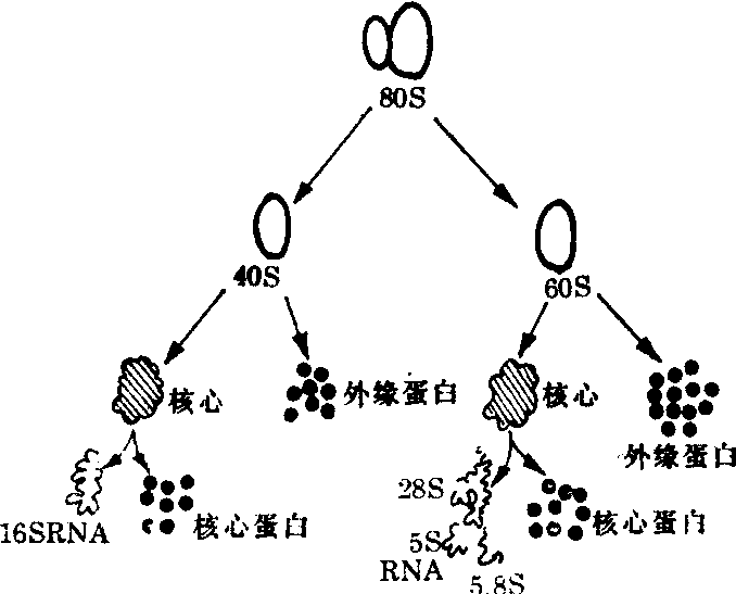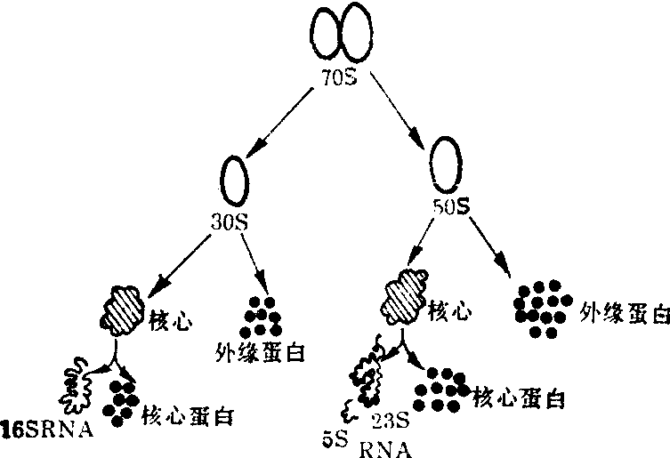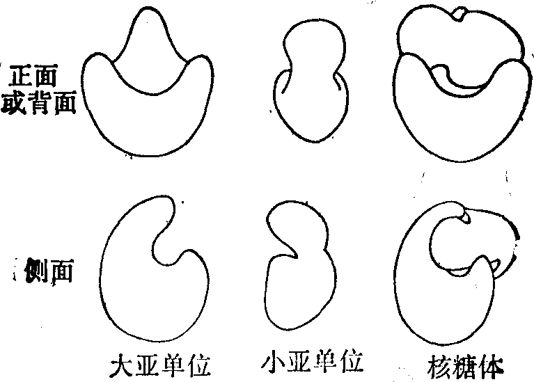核糖体模型示意图 为了了解蛋白质合成的分子机制,详尽阐明核糖体三维结构实属必要。如同研究酶的结构,理想的是获得2~3A分辨率的X线衍射图,但迄今尚未获得适于这种技术的核糖体结晶。只好采用他法: 免疫电子显微镜法(IEM)、蛋白质交联法、荧光能量传递和中子衍射等。I-EM的根据是抗核糖体各蛋白质的抗体可以在完整亚单位上和相关蛋白质起抗原抗体反应。同时恰当的染色又使核糖体或其亚单位可在电子显微镜下呈现出其形状,并且其甚不对称的形态具有提供很好标志的特异结构,方便了对抗体结合位置的辨认。如用对某一核糖体蛋白质特异的抗体和亚单位作抗原抗体反应,则由于IgG是两价的而形成了亚单位二聚体。抗体的Fab臂结合到亚单位,而结合位置则可视为该特定蛋白质暴露在核糖体该处表面上的抗原决定簇。按此即可勾划出亚单位的形状以及各个蛋白质的抗原决定簇在其上面的位置。此法随对资料的解释的不同而得出迥异的核糖体模型,希望进一步改善方法而求出一致的模型。图示从IEM资料构成出的一种模型。大亚单位形似摇床,小亚单位像胎儿; 核糖体如胎儿安睡在摇床上。用双功能试剂交联蛋白质可以决定蛋白质的相邻关系。从已经交联了的亚单位可得到交联的蛋白质,再用免疫化学或电泳等方法鉴定出相交联的蛋白质。在30s亚单位可以鉴定出三十多对交联的蛋白质,按此可提出在亚单位中各个蛋白质的相互关系。核糖体亚单位中两个蛋白质之间的距离也可应用荧光标记蛋白质的能量传递来测量。两种核糖体蛋白质各共价结合荧光剂,把这衍生蛋白质重组到亚单位中,根据荧光剂之间的能量传递效率就可计算出该两分子的距离。中子衍射可测量两个氘标记蛋白质重组在亚单位里的距离。各种方法各有长短,可相互补充,但核糖体的三维结构尚待解决。 线粒体的核糖体属70s类,解缔为30s和40s亚单位;在组成上和大肠杆菌者相差颇远。30s亚单位含一条RNA和约40种蛋白质;40s亚单位也只含一条RNA,但含约50种蛋白质。线粒体核糖体蛋白质含量高,占65~75%,且不含5s RNA。 真核细胞胞质核糖体质量约为4.6×106,沉降系数约80s。小亚单位质量1.5×106,含1分子18s RNA和约30种蛋白质。大亚单位质量随物种而异,自2.4×106(植物)至3.0×106(哺乳动物)不等,含3种RNA(28s、5.8s和5s)以及约50种蛋白质。80s比70s核糖体大,主要是蛋白质多了些。蛋白质在80s核糖体约占质量50%,而70s只占33%。这两类核糖体参与的蛋白质合成的各反应步骤甚相似,而蛋白质数目相差颇远;这或者是与蛋白质合成的调节机制在真核细胞远为复杂 (尤其在起始阶段)有关,或者是与核糖体要通过核膜有关。 18s RNA(0.7×106)在各物种间都很相近,而28sRNA(~1.7×106)则变化颇多。这两种RNA都经过大量的修饰作用,如Hela细胞的18s和28s RNA分别含46个和71个甲基,还有假尿苷和其他修饰过的碱基及糖。从多种物种的18sRNA中发现其3′端有一共同的八核苷酸片段——GAUCAUUA。人类的18s RNA和爪蟾(Xenopus)者约有60%的共同序列。人、小鼠,大鼠和兔的5s RNA是相同的。5.8s RNA含150~160个核苷酸,其功能相当于原核的5s RNA。而真核细胞的5s RNA都是外加上的。 80s核糖体的约70个蛋白质大多已经分离出,并纯化至均一。大鼠肝细胞核糖体蛋白质,小亚单位者的分子量自11,200~39,000不等,平均约21,400;大亚单位的自11,500~41,800,平均21,200。已经知道了50多种核糖体蛋白质的氨基酸组成。多数是富含精氨酸和赖氨酸的碱性蛋白质。也有少数酸性蛋白质。蛋白质种类的切实数目还未弄清。因方法不同,各实验室报告的数字互有出入。但同一动物的不同器官的核糖体蛋白质在双向聚丙烯酰胺凝胶电泳上是相同的。不同物种核糖体蛋白质也近似,但免疫方法检查大鼠和鸡的核糖体蛋白质,却很不一样。真核细胞核糖体蛋白质和原核细胞者在免疫化学上未见交叉反应。但是动物的L40/L41和酵母的一种酸性蛋白质在功能上却都可和大肠杆菌的L7/L12互换,提示这些蛋白质的高度保守性。真核细胞核糖体结构资料很少,电镜初步所见除大小不同外,形态大致相似。 ☚ 肽链合成的终止 蛋白质合成的抑制作用 ☛ 核糖体 核糖体核糖体是细胞的重要结构之一,是合成蛋白质的细胞器,其唯一的功能是将氨基酸装配成肽链。核糖体几乎存在于一切细胞内,不论是原核细胞或真核细胞中均含有大量核糖体,即使是最简单的细胞支原体也至少含有数以百计的核糖体,目前仅发现在无核红细胞等极个别高度分化类型的细胞内没有核糖体,因此可以认为核糖体是细胞最基本的,不可缺少的结构。 图1 70S核糖体在不同镁离子浓度下的物理状态 对70S核糖体(以细菌的核糖体为例)的结构与成分进一步分析见图2。核糖体先降解为50S与30S的大小亚单位,其分子量分别为1.8×106与0.8×106,将大小亚单位分别用酚提取,并进一步分析核酸与蛋白质的含量;小亚单位中含有一个16S的rRNA分子,分子量为5.5×106约含1650个核苷酸。大亚单位中主要含有一个23S的rRNA分子,其分子量为1.1×106,约含3 300个核苷酸,在大亚单位中经常还有一个5S的RNA分子,分子量为4×106,仅含115—116个核苷酸。从30S的亚单位中已发现含有20种不同的蛋白分子,而在50S的大亚单位中约含34种蛋白分子。 80S的核糖体普遍存在于真核细胞内,对分离的核糖体进行理化特性测定,发现与原核细胞核糖体具有类似的现象。随着溶液