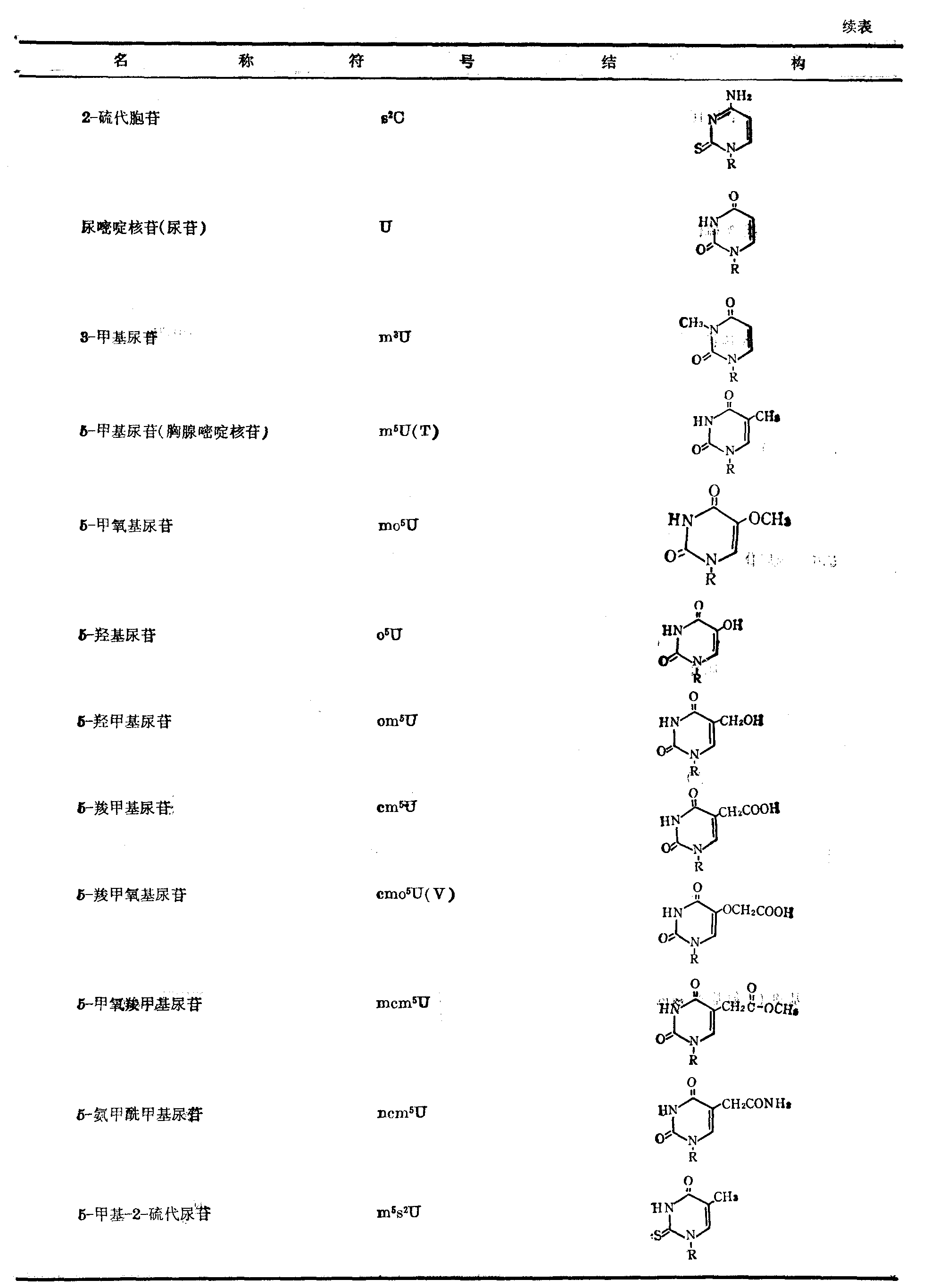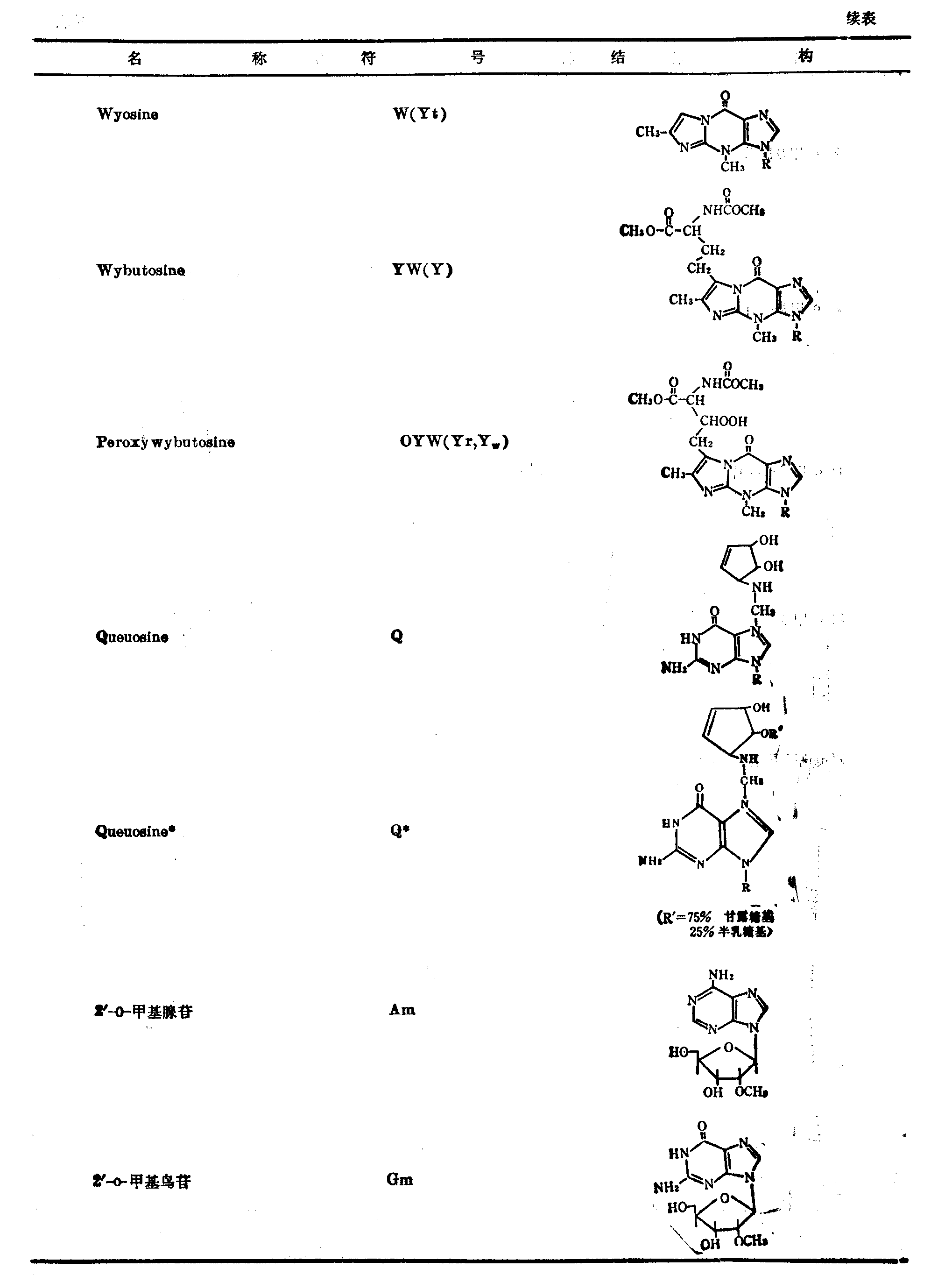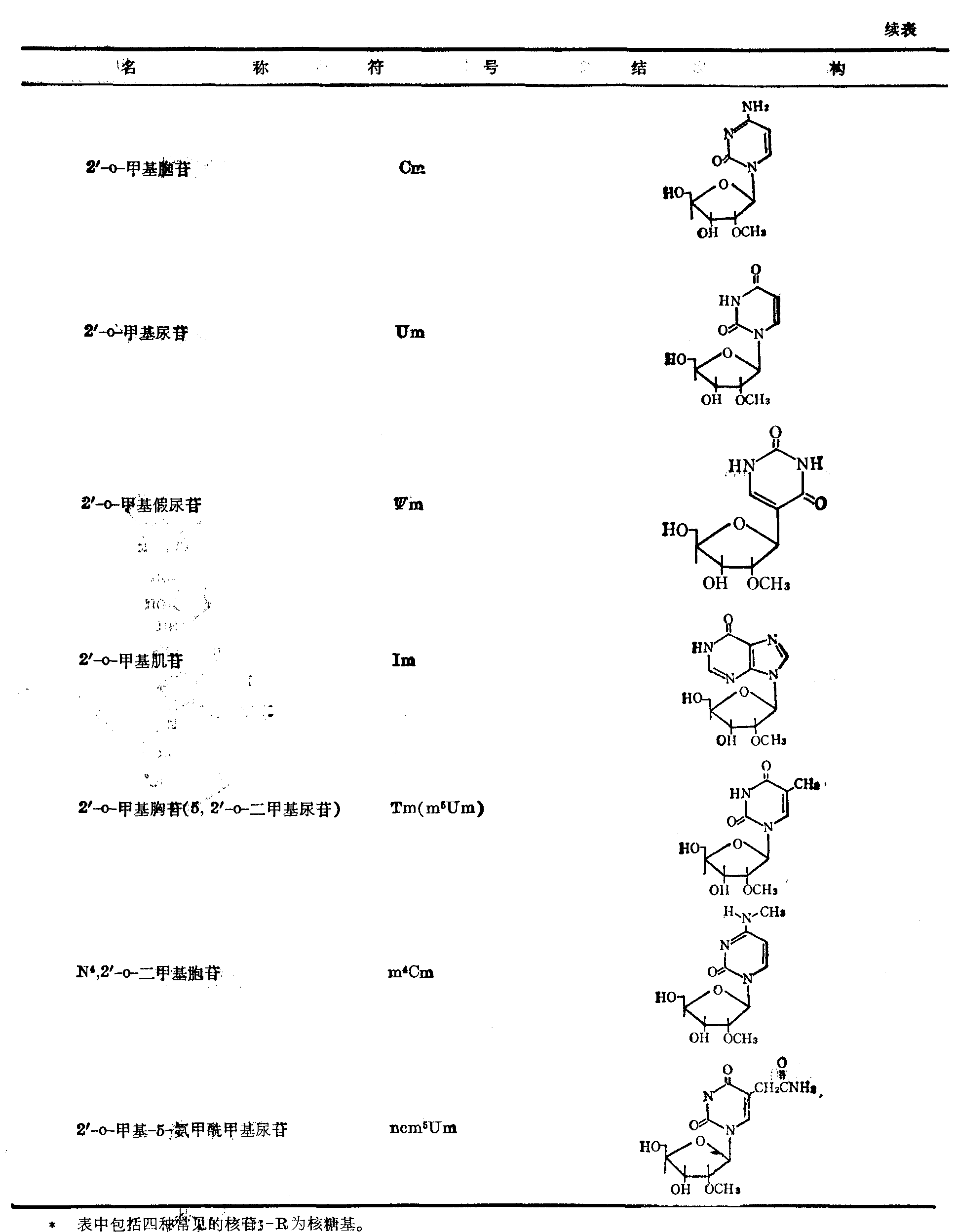 释义 | 核糖核酸的化学组成 核糖核酸的化学组成核糖核酸(RNA)是由基本结构单元——核糖核苷酸以3′,5′-磷酸二酯键连接起来的长链分子(1983年以来发现RNA可有分枝结构,即除3′,5′-磷酸二酯键的主链外,还可有2′,5′-磷酸二酯键的支链)。(图1)。核糖核苷酸则由碱基[两种常见的嘌呤碱,即腺嘌呤(A)和鸟嘌呤(G),以及两种常见的嘧啶碱,即胞嘧啶(C)和尿嘧啶(U)](图2)、核糖(β-D-核糖)和磷酸三部分构成。除了这四种核糖核苷酸外,在成熟RNA分子中几乎都或多或少地含有化学结构特殊的“稀有” 核苷酸或称作修饰核苷酸。已经确定了化学结构的修饰成分有60种左右(表)。RNA中修饰成分绝大部分可看作是四种常见核糖核苷酸的碱基或核糖结合了某种基团后的产物。碱基上的取代形式有甲基化、硫代、甲硫代、乙酰化、氢化以及带有侧链的如氨基酸基、异戊烯基、糖基、羧基、羟基等。有的结构极为复杂,称为高度修饰成分,例如在不同来源的苯丙氨酸tRNA中有一种具有强烈荧光特性的W碱基及其衍生物。这类高度修饰的碱基可看作是鸟嘌呤与带有取代基的丙烯加成的产物。在某些tRNA中发现了二种称作Q和Q*的碱基 (见表)。它们是含7去氮鸟嘌呤杂环的化合物。Q中嘌呤7位通过氨甲基与环戊烯二醇连接; Q*的基本结构与Q相同,但其环戊烯二醇基上还带有β-D-甘露糖和β-D-半乳糖。这是迄今已发现的极个别的在碱基上带有糖基的稀有成分。在真核生物中,某些细胞核小分子RNA的5′端存在着一种2,2,7-三甲基鸟苷(m2,2,7G),这种成分在其他RNA中还未见过。除碱基上的修饰外,另一类是核糖的2位上带有甲基的修饰成分,已发现的有9种。此外,还有一种尿嘧啶核苷的异构体——假尿嘧啶核苷(ψ),它是尿嘧啶-5-核糖核苷。它几乎在所有tRNA、一些细胞核小分子RNA和许多rRNA中存在。修饰核苷酸的存在给RNA分子增加了许多特殊的信号,这些信号在RNA分子中所起的作用,目前知道得很少。 图1 RNA分子的化学结构