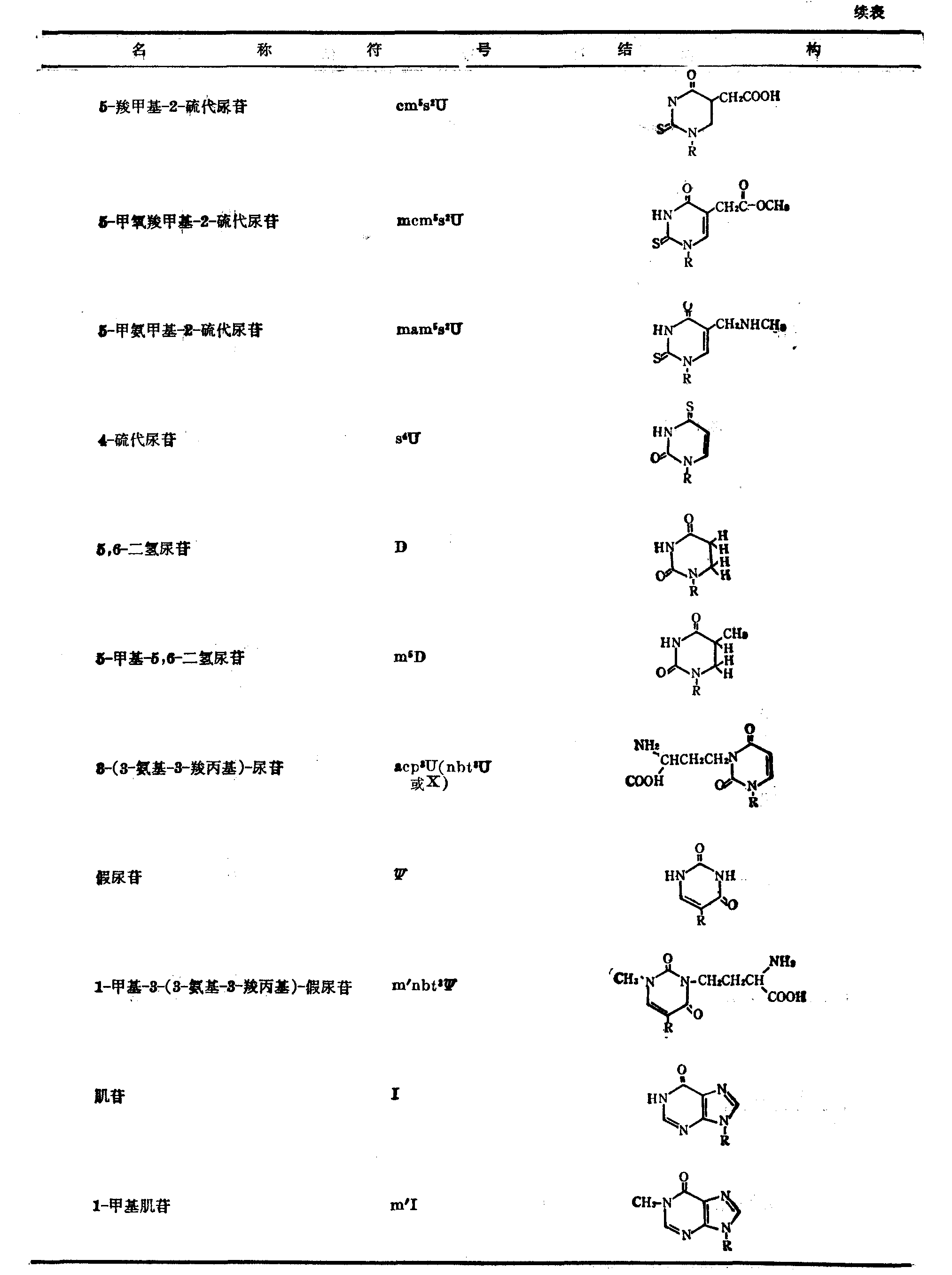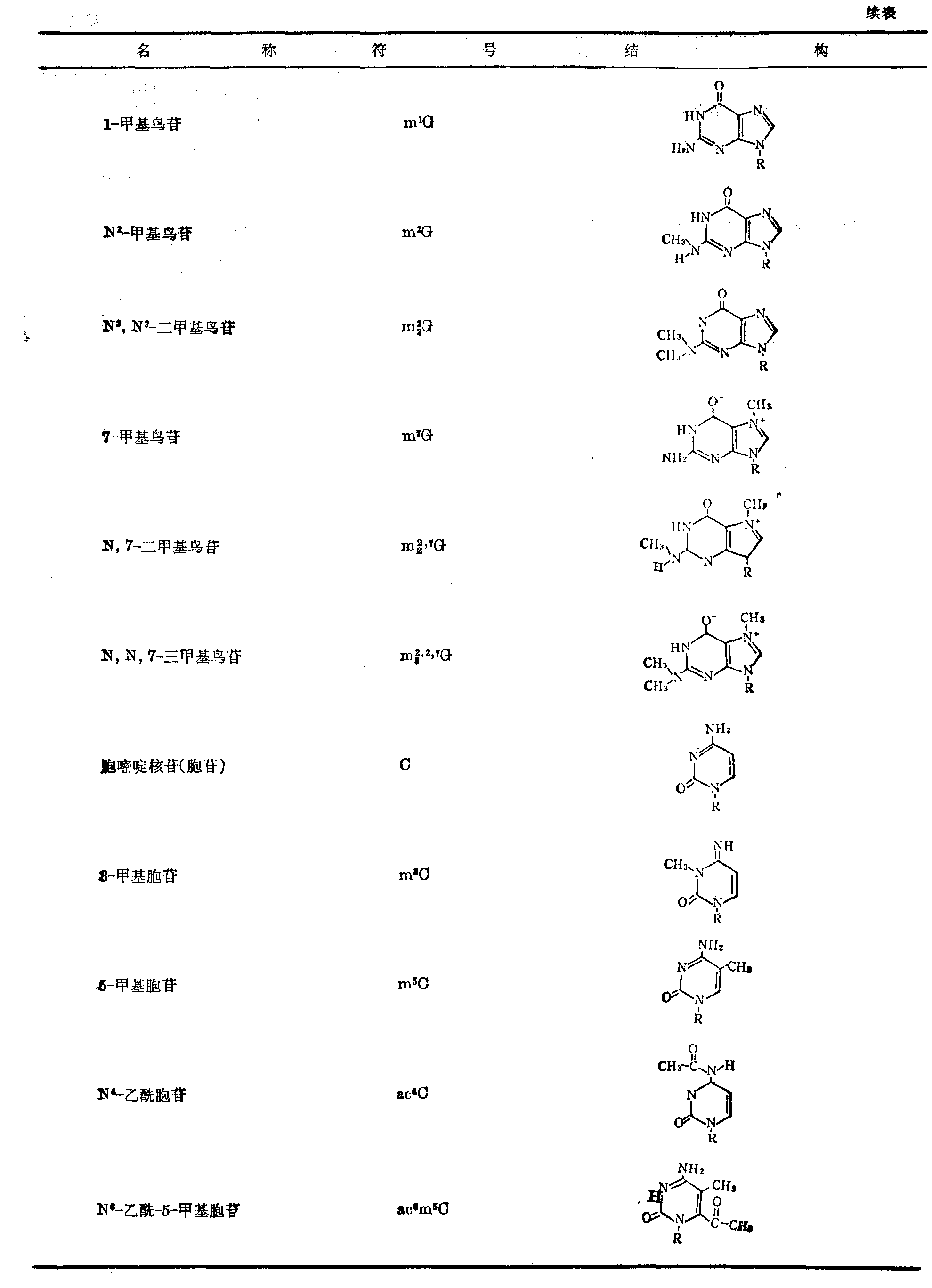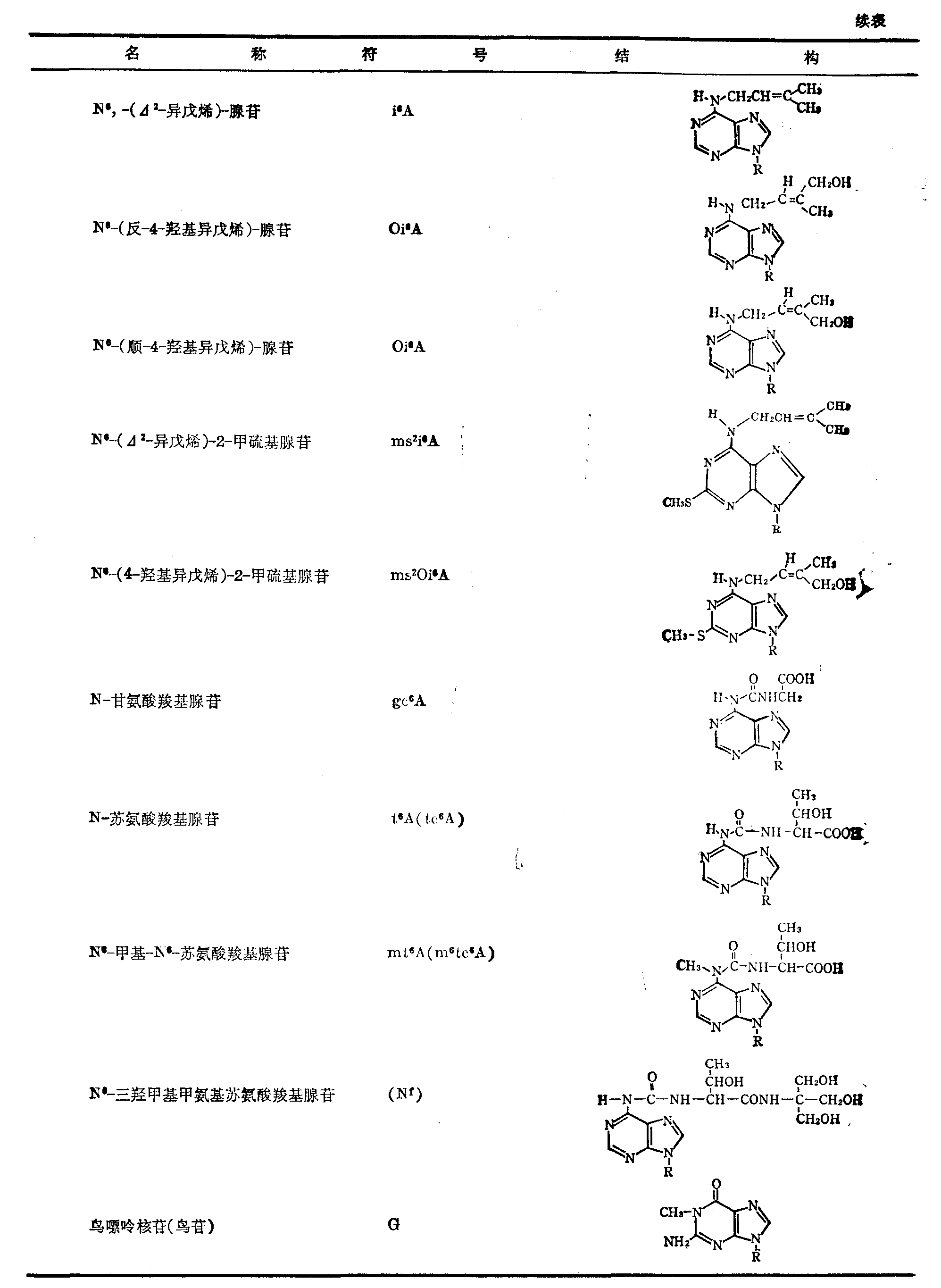 释义 | 核糖核酸的化学组成 核糖核酸的化学组成核糖核酸(RNA)是由基本结构单元——核糖核苷酸以3′,5′-磷酸二酯键连接起来的长链分子(1983年以来发现RNA可有分枝结构,即除3′,5′-磷酸二酯键的主链外,还可有2′,5′-磷酸二酯键的支链)。(图1)。核糖核苷酸则由碱基[两种常见的嘌呤碱,即腺嘌呤(A)和鸟嘌呤(G),以及两种常见的嘧啶碱,即胞嘧啶(C)和尿嘧啶(U)](图2)、核糖(β-D-核糖)和磷酸三部分构成。除了这四种核糖核苷酸外,在成熟RNA分子中几乎都或多或少地含有化学结构特殊的“稀有” 核苷酸或称作修饰核苷酸。已经确定了化学结构的修饰成分有60种左右(表)。RNA中修饰成分绝大部分可看作是四种常见核糖核苷酸的碱基或核糖结合了某种基团后的产物。碱基上的取代形式有甲基化、硫代、甲硫代、乙酰化、氢化以及带有侧链的如氨基酸基、异戊烯基、糖基、羧基、羟基等。有的结构极为复杂,称为高度修饰成分,例如在不同来源的苯丙氨酸tRNA中有一种具有强烈荧光特性的W碱基及其衍生物。这类高度修饰的碱基可看作是鸟嘌呤与带有取代基的丙烯加成的产物。在某些tRNA中发现了二种称作Q和Q*的碱基 (见表)。它们是含7去氮鸟嘌呤杂环的化合物。Q中嘌呤7位通过氨甲基与环戊烯二醇连接; Q*的基本结构与Q相同,但其环戊烯二醇基上还带有β-D-甘露糖和β-D-半乳糖。这是迄今已发现的极个别的在碱基上带有糖基的稀有成分。在真核生物中,某些细胞核小分子RNA的5′端存在着一种2,2,7-三甲基鸟苷(m2,2,7G),这种成分在其他RNA中还未见过。除碱基上的修饰外,另一类是核糖的2位上带有甲基的修饰成分,已发现的有9种。此外,还有一种尿嘧啶核苷的异构体——假尿嘧啶核苷(ψ),它是尿嘧啶-5-核糖核苷。它几乎在所有tRNA、一些细胞核小分子RNA和许多rRNA中存在。修饰核苷酸的存在给RNA分子增加了许多特殊的信号,这些信号在RNA分子中所起的作用,目前知道得很少。 图1 RNA分子的化学结构
