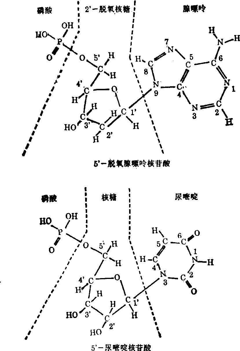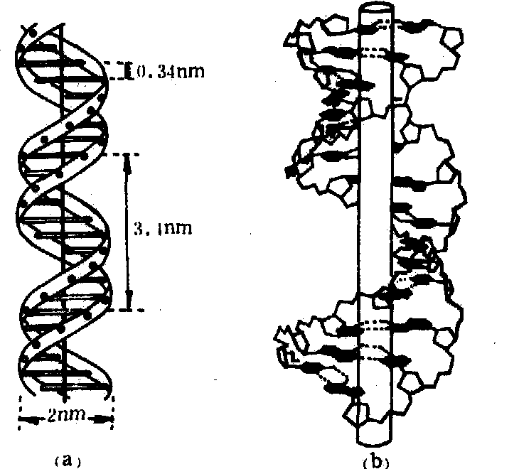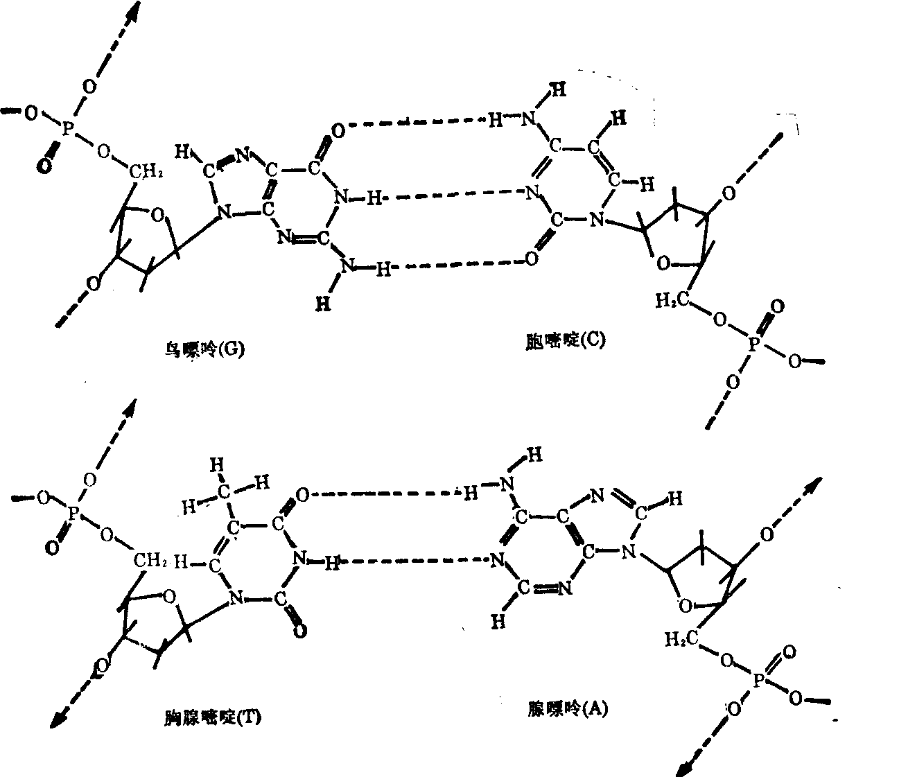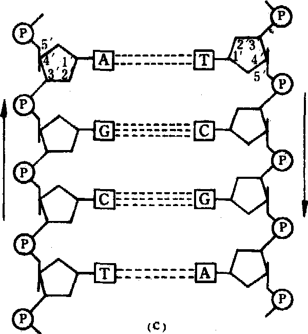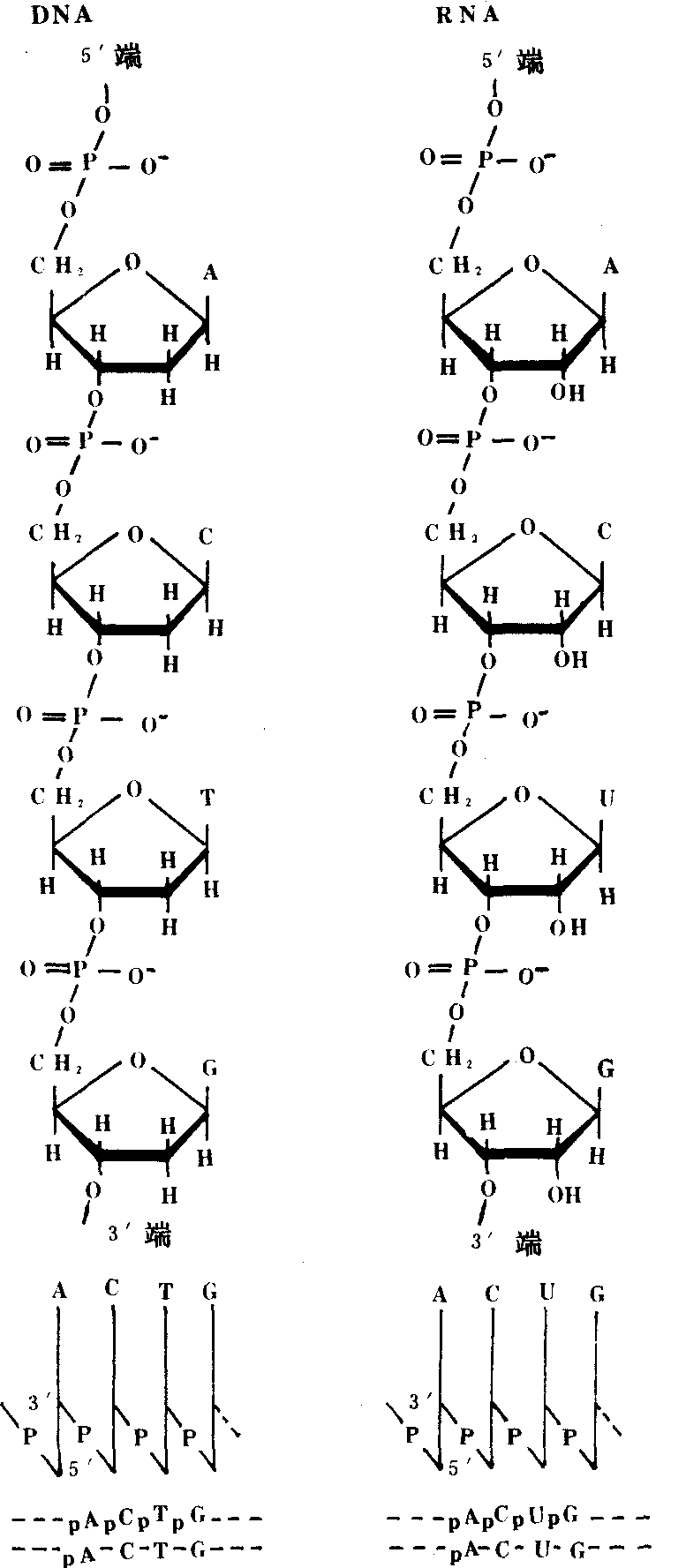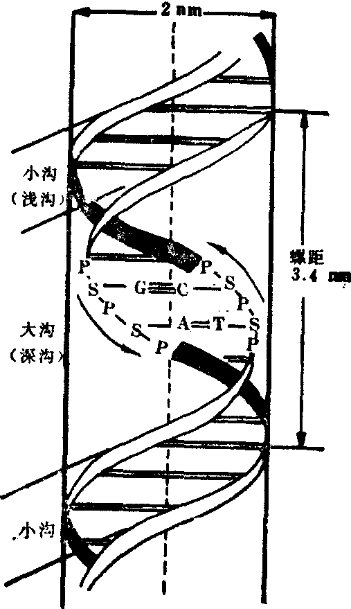 二磷酸腺苷、三磷酸腺苷(或其他种二或三磷酸核苷)以及环化核苷酸均为自由存在于细胞内参与物质代谢的重要物质,但不是组成DNA和RNA的直接成分。 核酸的结构 已知核酸是由许多单核苷酸组成的多聚体。相邻的核苷酸分子之间,前一分子的戊糖C—3′与后一分子戊糖的C—5′以磷酸二酯键相连,所以核酸又称多核苷酸(图3)核酸分为脱氧核糖核酸与核糖核酸两类。DNA分子中的戊糖为脱氧核糖,RNA分子中的戊糖为核糖。DNA分子含腺嘌呤(A)、鸟嘌呤(G)、胞嘧啶(C)和胸腺嘧啶(T)四种碱基,RNA分子中含腺嘌呤、鸟嘌呤、胞嘧啶和尿嘧啶(U)。核酸分子的存在方式,除少数例外,一般DNA分子呈双链,RNA分子呈单链。 图3 RNA多核苷酸的结构 DNA多核苷酸除了在戊糖环的第2′位上缺少一个氧原子外,其余均与RNA多核苷酸相似 DNA的一级结构 是指多核苷酸链中核苷酸的排列顺序。由于核酸中核苷酸彼此之间的差别在于所含碱基的不同,故DNA的一级结构即指分子中的碱基的排列顺序。描写核酸的一级结构时,以5′磷酸末端写于左侧,3′端写于右侧,中间部分为各核苷酸残基。 DNA是复杂的生物高分子,也是目前所知分子量最大的一类化合物,一分子DNA可含几千到几千万个核苷酸对,根据这些核苷酸的数量、种类以及不同的排列顺序构成DNA分子的一级结构。 DNA的二级结构 华生(Watson)和克里克(Crick)(1953) 根据X射线衍射的数据提出了DNA的双螺旋结构模型。 ❶DNA分子是由两条并列的多核苷酸链,围绕一个共同的轴盘绕而成的右手双螺旋结构。螺旋直径为2nm。螺旋盘绕形成一个深沟和一个浅沟(图4)。两条多核苷酸链走向相反,一条链从上到下为5′—3′端,另一条链为从下向上5′—3′端,构成反向平行排列的双螺旋。 ❸两条多核苷酸链上相应的碱基借氢键互相连结成互补碱基对即A与T或T与A,C与G或G与C之间互补(图5)。A—T或T—A之间有两个氢键,C—G或G—C之间有三个氢键,互补的碱基对在一个平面上与假想的中心轴垂直。 ❹碱基对之间的能量为12.6—29.3kJ/mol(3—7kcal/mol),由于氢键多,故可维持双螺旋结构。碱基对与碱基对之间的距离为0.34nm,每一螺旋含10个碱基对,每螺距为3.4nm。另外相邻碱基对之间还有范氏引力的作用,也可稳定其空间结构。上述为活体及溶液中常见的DNA形式,通称B型。当湿度低于75%时,B型DNA可转变为A型,其碱基对不垂直于双螺旋的中心轴,倾斜约20度,螺距降为2.8nm,每一螺旋含11个碱基对。B型与A型的水合程度不同,是DNA分子在天然条件下的两种基本形式。此外还发现有C型双螺旋,与B型相似但螺距为3.3nm,每一螺旋9个碱基对。 图4 DNA的双螺旋结构 晚近有人报告,用人工合成的脱氧六核苷酸dCGCGCG晶体和定向的聚d(GC)· d(GC)进行X射线衍射分析,发现这些晶体的结构为左旋的,称为Z—DNA,每螺旋含12个核苷酸,螺距为 4.46nm,直径为1.8nm,呈细长而伸展状态。碱基对比较靠近双螺旋的外侧,表面只有浅沟而无深沟。并认为具 (CG)n结构的DNA溶液从低盐浓度到高盐浓度时,右手螺旋DNA (R—DNA)会转变为左手螺旋DNA(L—DNA),两者一般处于动态平衡。此外,L—DNA与R—DNA的明显不同,还有: Z—DNA分子中磷原子走向为锯齿形因而称之为Z—DNA,其鸟嘌呤以顺式出现,脱氧核糖的C—3′外露。而R—DNA分子中的鸟嘌呤以反式出现,脱氧核糖的C—2′外露。左手螺旋DNA的生理功能还不清楚,据认为可能与基因调控有关。 DNA的三级结构 DNA分子在双螺旋结构的基础上,还可进一步形成环状或环状DNA超螺旋结构,即扭成麻花状。大肠杆菌的DNA呈环状,脊椎动物和无脊椎动物的线粒体DNA也呈环状,但在自然状态下扭成麻花形,若破坏双链中的一股则松为环状,用酶或机械力量破坏DNA双链,扭曲的分子则变为两端游离的直链。真核生物细胞核中的DNA具有一种特殊的超螺旋结构,即DNA双螺旋分子有规律地缠绕于组蛋白八聚体上形成核小体,核小体是染色质的基本结构单位(见“染色体”条)。 RNA的结构 RNA的分子结构与DNA不同,绝大多数天然RNA分子都以单链形式存在。但RNA多核苷酸链的某些部位能够折叠,在折叠区中碱基的位置靠近,也可通过氢键形成互补对,从而使单链RNA局部呈发夹形,并可进一步盘绕成小的双螺旋区。其中不能形成互补对的区域仍为单链,呈环状凸起。例如80年代初用X射线衍射技术研究tRNA分子结构,证明其空间结构为三叶草形,有4个环和一个柄,并进一步折迭成倒L形的三级结构(图6)(见“转移核糖核酸”条)。 图5 核苷酸中的互补碱基对 图6 tRNA的三叶草结构示意图 核酸的变性作用 在某些条件的作用下,DNA的双螺旋或RNA的发夹结构因氢键断裂而松散,变为无规则的线团状,这种螺旋的转化作用称为核酸的变性。引起核酸变性的条件可称为变性因子,如加热,改变pH和某些有机溶剂都可引起核酸变性。变性后的DNA或RNA理化性质及生物学性质均发生改变。变性可使其紫外光的吸收能力增加,在波长260nm处的吸光度上升,这种现象称增色效应; 变性使DNA旋光性显著下降; 因DNA变性双链松散而粘度明显降低。变性可使其生物学功能减小或消失。使DNA变性的温度称为“变性温度”或“融点”。DNA分子中所含的C—G,A—T碱基对数目不同、融点也不同。C—G比A—T多一个氢键,分开它们所需的温度也较高。温度下降至融点下25℃时,逐渐冷却含变性DNA的溶液,分开的单链DNA可恢复为原来的双螺旋结构,此现象称为复性。DNA分子变