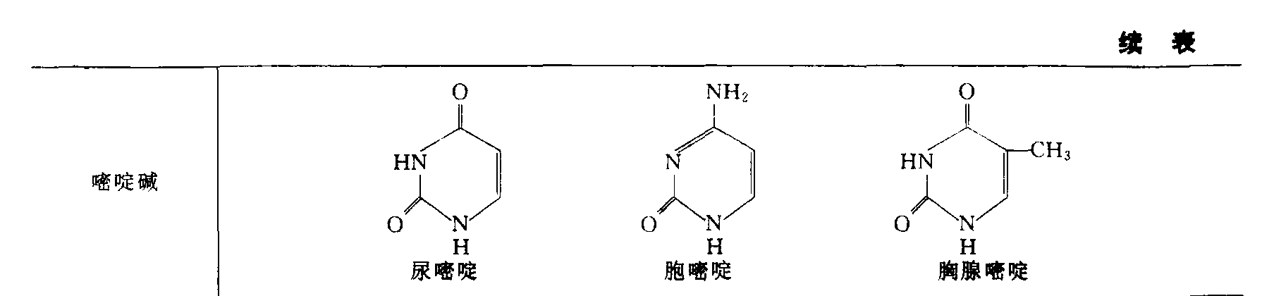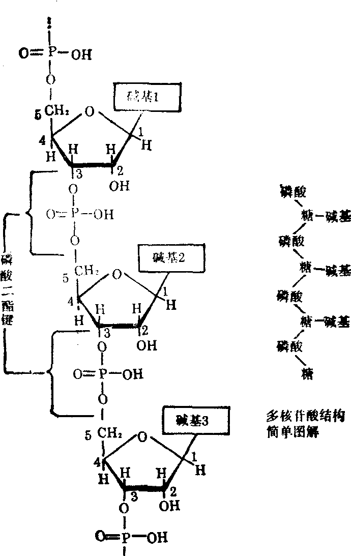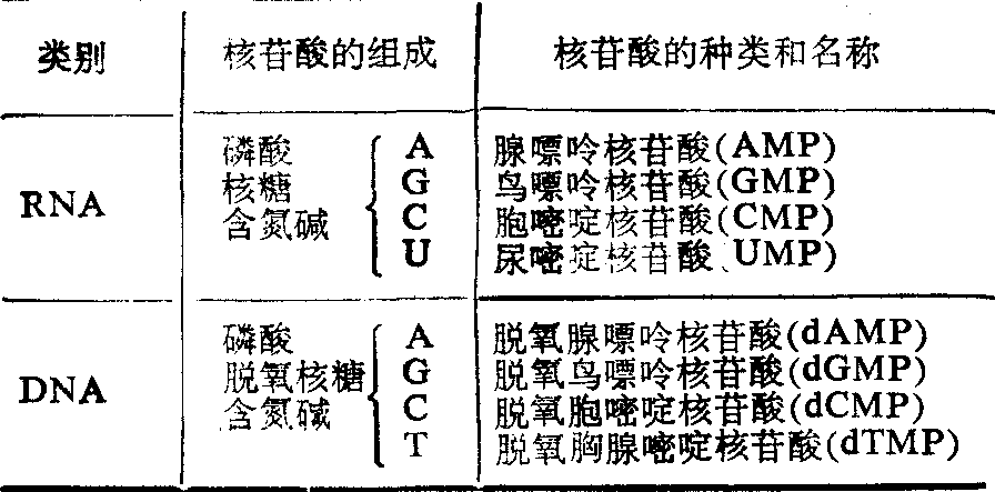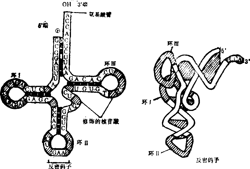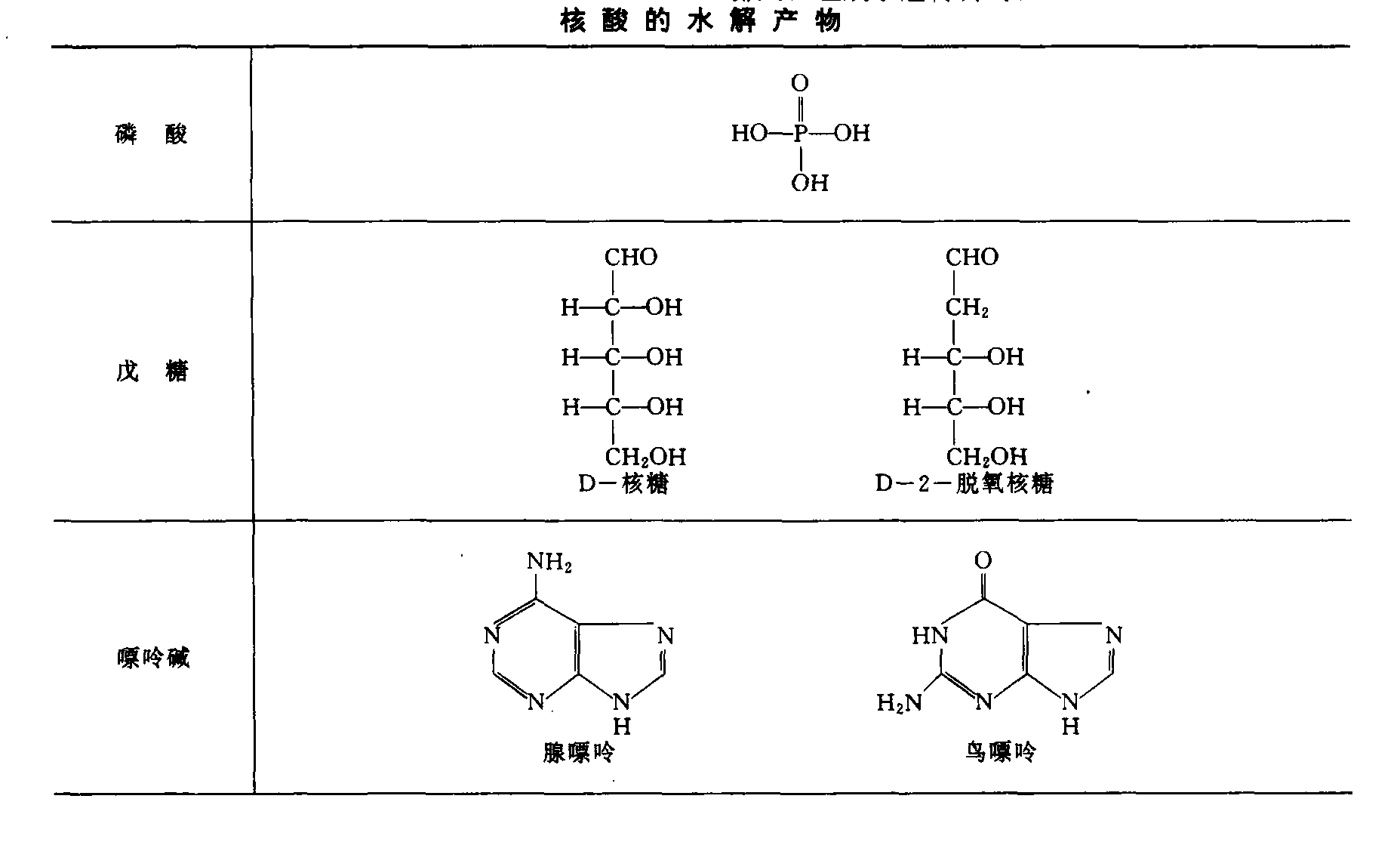 RNA的类别和tRNA的结构 RNA基本上以单链状态存在,链上有些区段由于碱基互补形成链内氢键而呈局部双链结构,另一些区段不形成碱基对而呈环状。动物,植物和微生物细胞内都含有3种主要的RNA,即mRNA、rRNA和tRNA。mRNA 分子是指令蛋白质合成的DNA碱基顺序(结构基因)的拷贝,其长度由数百核苷酸至数千核苷酸。以RNA作为遗传物质的病毒,其mRNA既可作遗传物质复制的模板,也可作蛋白质合成的模板。rRNA分子为核糖体的构成部分。按沉淀系数分,原核细胞中有5s、16s和23s,真核细胞中有5s、5.8s、18s和28s。5s、16s和23s,其长度分别相当于120、1 700和4 000个核苷酸。tRNA分子为蛋白质合成中活化氨基酸单体的载体,tRNA分子中含70~93个核苷酸。70多种 tRNA分子的顺序测定已完成。第一个被测定碱基顺序的tRNA 分子为酵母丙氨酰tRNA,由霍利 (R. Hol-ley)工作7年后于1965年完成。该分子为76个核苷酸构成的单链。所有的tRNA分子都含有很多稀有碱基(7~15个/分子),稀有碱基通常由A、U、C和G经甲基化或二甲基化酶促修饰而成,其作用可能是阻止某些具有其他功能的碱基间形成氢键。另外,甲基化可使tRNA分子的某些区域疏水化,以便使之易与合成酶和核糖体蛋白质相互反应。tRNA的5′端是被磷酸化的,5′端残基通常是PG。tRNA 3′端的碱基顺序为CCA。活化的氨基酸结合于末端腺苷的3′-羟基。tRNA中半数核苷酸可进行碱基配对形成双螺旋。分子中5个区域的碱基不能配对,即3′CCA末端区、TψC环(含核糖胸腺嘧啶—拟尿嘧啶—胞嘧啶)、额外环 (残基数目可变化)、DHU环(含n个二氢尿嘧啶残基)和反密码子环。mRNA的二级结构更复杂,有些呈花环状。近年对酵母的苯丙氨酰tRNA进行X—射线结晶学研究,发现其三级结构呈倒L形。1982年初,中国学者人工合成了具有高度生物活性的酵母丙氨酰转移核糖核酸。 核酸nucleic acid由核苷酸通过3′,5′-磷酸二酯键连接而成的一类生物大分子。首先从细胞核中提取得到,含磷而呈酸性,故名。按其所含戊糖不同分为脱氧核糖核酸(缩写符号为DNA)和核糖核酸(缩写符号为RNA)两大类。存在于一切生物中,起着贮存和传递遗传信息以及指导蛋白质生物合成的作用。是生物化学、分子生物学和分子遗传学等生命科学重点研究的对象之一。 核酸由核苷酸组成的生物大分子。高分子化合物的一类。生命的基础物质之一。对生物的生长、遗传、变异等起着重要的决定作用。由几十到几万个核苷酸通过磷酸酯键连接而成。存在于细胞核和细胞质中,可以人工合成。1869年由J.F.米舍尔发现。根据所含的戊糖分为脱氧核糖核酸(DNA)和核糖核酸(RNA)2类。核苷酸由1分子芳香碱基、1分子戊糖及1~3分子磷酸基团构成。核糖核酸(RNA)按功能和性质分为信使RNA(mRNA)、转移RNA(tRNA)和核糖体RNA(rRNA)3种。人体正常新陈代谢每天至少需要2~2.5 g核酸,一般从饮食中可摄取到0.5~1 g,其缺额需从外源性核酸补充。 核酸 核酸hesuan许多核苷酸按一定顺序连接而成的生物高分子。根据其核苷酸结构单元中的糖组分不同,分为脱氧核糖核酸(DNA)和核糖核酸(RNA)两大类。DNA分子巨大,是染色体的主要成分。除细胞分裂时期外,比较稳定。DNA是主要的遗传物质,基因就是有遗传效应的DNA片段。人和动物通过受精卵将亲代的全套基因传给子代。基因功能的表达是以蛋白质的形式体现出来的。生物体的形态主要决定于蛋白质,各种各样的功能也主要由蛋白质来完成。但基因决定蛋白质的结构。细胞有3种主要的RNA,它们都在蛋白质的生物合成中起作用。这3种RNA是:核糖体RNA(rRNA)、转移RNA(tRNA)和信使RNA(mRNA)。蛋白质生物合成在核糖体上进行。rRNA是核糖体的组分,tRNA起转移氨基酸的作用,mRNA是蛋白质合成的模板。DNA和RNA都是没有分支的多核苷酸长链。链中每个核苷酸元件的戊糖的3'-羟基和毗邻核苷酸的戊糖的5'-磷酸相连,构成3',5'-磷酸二酯键,由于磷酸二酯键有方向性,每条线形核酸链都有一个5'末端和一个3'末端。多核苷酸链中核苷酸残基的排列顺序(碱基序列)是核酸的一级结构。核酸线形分子折叠盘绕所构成的三维结构称空间结构或高级结构。空间结构可包括二级结构与三级结构。这些不同层次的结构均与其功能有关。细胞内核酸的磷酸基在生理pH时带负电荷,使整个分子呈酸性。分子中的嘌呤和嘧啶碱基相对不溶于水,具有疏水性。另外,碱基强烈吸收紫外光,使核酸分子也有吸收紫外光的特性,最大吸收峰在260纳米左右。生物体内有各种能水解核苷酸单元间磷酸二酯键的核酸酶。参见“脱氧核糖核酸”和“核糖核酸”条。