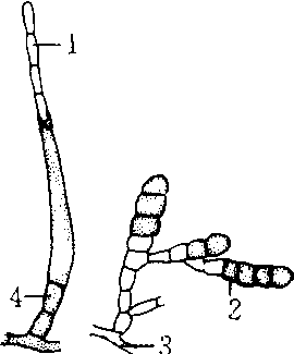 根串珠霉属 1.分生孢子 2. 厚壁孢子 3. 菌丝 4. 分生孢子梗 |