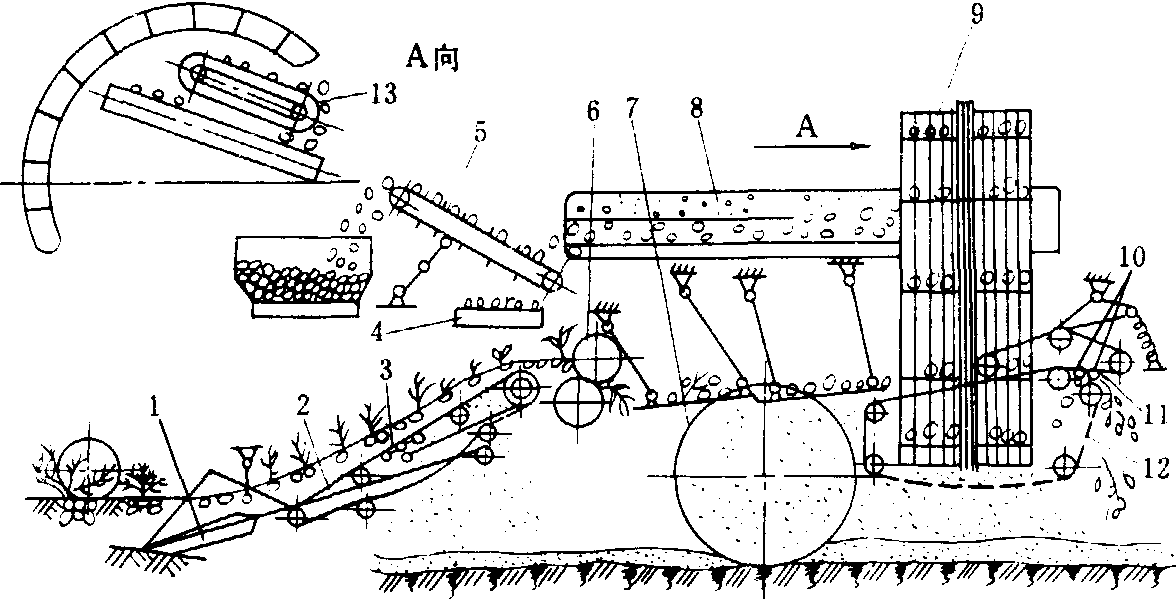 图 1 升运链—筛式联合收获机工艺过程示意图 1. 挖掘铲; 2. 升运器; 3. 强制抖动机构; 4. 杂物输送器; 5. 装载输送器; 6. 土块 压碎辊; 7. 分离筛; 8. 剔选输送器; 9. 滚筒升运器; 10. 分离杆; 11. 夹持输送器; 12. 杆条式输送器; 13. 净选器