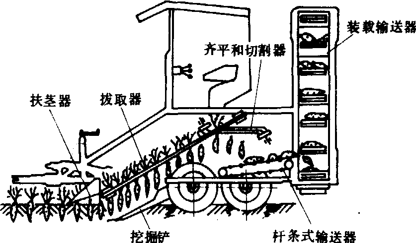 图 2 拔取式收获机 在分段收获时,使用茎叶收获机、挖掘机和捡拾机。茎叶收获机由仿形板、转子、导向板和输送器组成。茎叶收获机的仿形板沿地面滑行,转子切割茎叶,由导向板和输送器将茎叶排出机外。继而用挖掘机挖出块根,成条铺于地面。最后用捡拾机收集块根,将土分离。 |