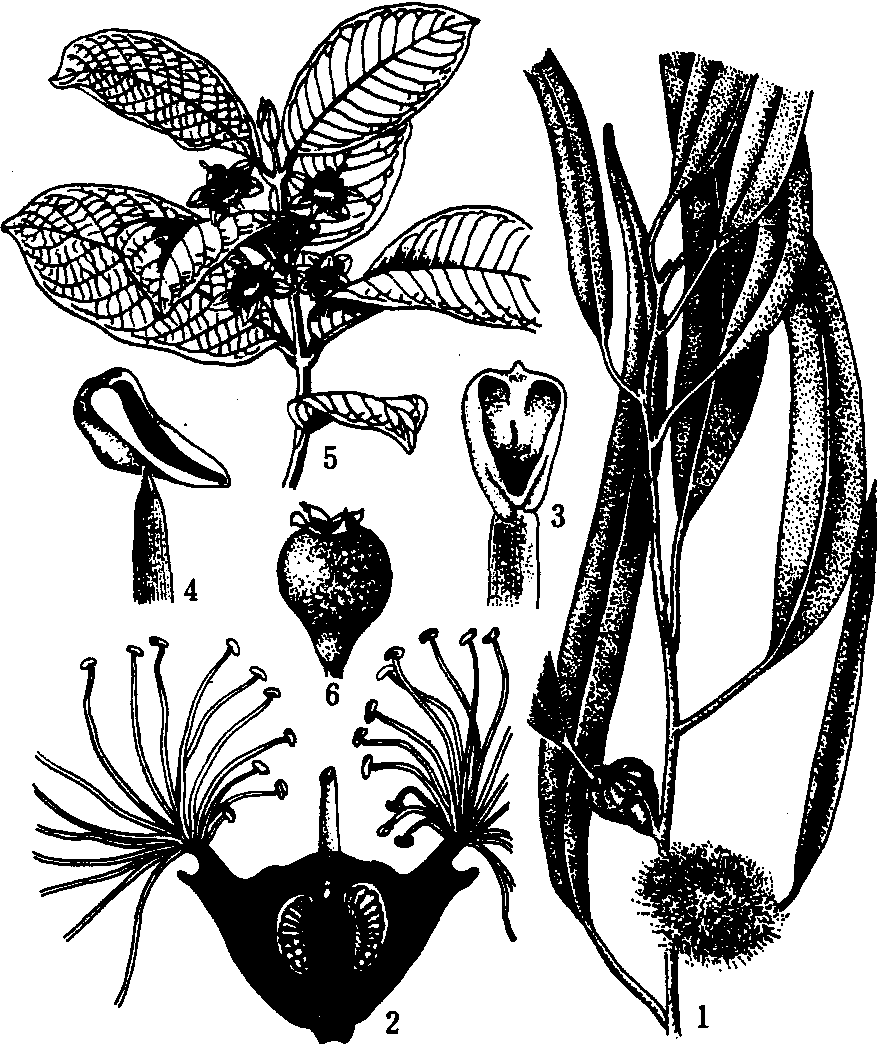 乔木或灌木,具单细胞毛或多细胞毛。有散生的裂生精油分泌腔,多数有外生菌根。单叶对生或互生,稀轮生,有透明油点。无托叶。气孔器无规则型,稀为平列型。花两性,有时杂性,单生,或为聚伞、总状花序,通常具2枚小苞片。花萼合生,4~5裂,或为帽状体脱落,有时极退化。花瓣4~5枚,有时靠合为一帽状体,或无花瓣。雄蕊通常多数,着生于蜜腺盘边缘,花蕾时内弯或折曲,花丝分离或基部合生为4或5束,与花瓣对生。花药纵裂或顶孔开裂,药隔具一顶生腺体。花粉二细胞型,通常具3孔沟,稀具2孔沟或3孔。子房下位或半下位,心皮2至多数,子房室与心皮同数,中轴胎座。胚珠2至多数,倒生或弯生。胚乳核型。蒴果,浆果,核果或坚果,顶部常有隆突的萼檐。种子无胚乳,胚直或弯曲马蹄形或螺旋形。染色体x=11,有时6~9或12。 本科为重要木材资源。许多种的叶含芳香油,为工业、医用原料及食用香料。丁香(Syzygium aroma-ticum)的花蕾供药用和化工原料。热带水果如番石榴(Psidium guajava)、蒲桃(Syzygium jambos)。桉属(Eucalyptus)许多种供观赏和蜜源植物。 桃金娘科myrtle family; Myrtaceae双子叶植物,乔木或灌木。单叶,全缘,对生或互生,稀轮生,有透明油点,无托叶。花两性,有时杂性,单生,或为聚伞、总状花序;通常有2枚小苞片;花萼4~5裂,或为帽状体脱落,有时极退化;花瓣4~5枚,有时靠合为一帽状体,或无花瓣;雄蕊通常多数,着生蜜腺盘边缘,花蕾时内弯或折曲,花丝分离或基部合生为4或5束,与花瓣对生,花药纵裂或顶孔裂,药隔有一顶生腺体,花粉通常具3孔沟,稀具2孔沟或3孔;子房下位或半下位,心皮2至多数,子房室与心皮同数,胚珠2至多数。蒴果、浆果、核果或坚果,顶部常有隆突的萼檐。种子无胚乳。x=11,有时6~9或12。约140属,3 000余种,分布热带、亚热带,以及温带的澳大利亚,主产美洲和大洋洲。中国9属,126种,引种5属,73种,分布于南部各省。为重要木材资源;许多种的叶含芳香油,为工业、医用原料及食品香料;丁香的花蕾供药用和化工原料;热带水果如番石榴、蒲桃;桉属许多种供观赏或为蜜源植物。 |