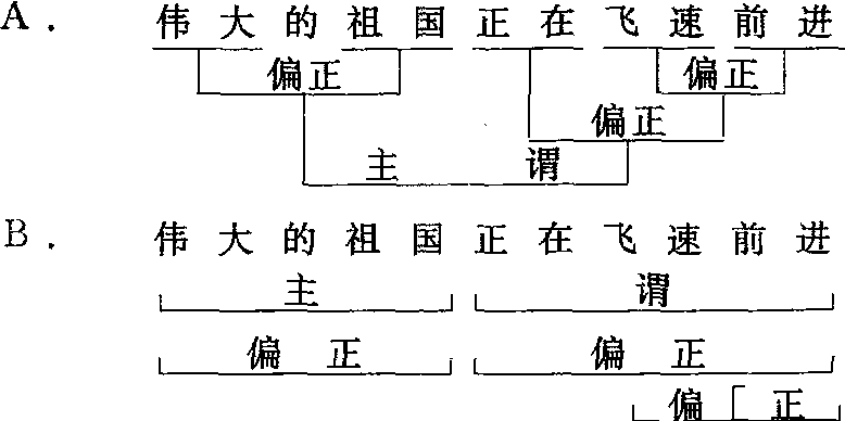 用框架形式表示句子结构层次和结构关系的方法。又分两种:(a)从小到大。从最小的语言单位逐层组合, 直到组合成最大的语言片断。 如下图A; (b) 从大到小。 从整个语言片断分析起, 一层一层地剖析到最小的语言单位。如下图B。也有的不用文字说明结构关系, 仅用框架表明结构层次。