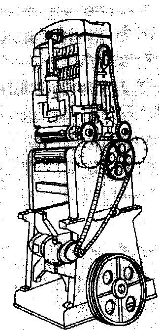 释义 | 框锯机gang saw将多条直锯条紧固在锯 通用框锯机 类型 按工艺和用途分类,有通用框锯机和专用框锯机两类。通用框锯机为锯割材长3.5米以上、直径14~60厘米原木的框锯。专用框锯包括下述5种: ❶短原木框锯。不配置接送料小车,只有3~4对接送料辊筒,专门割制1~2米长的短原木。 ❷剖分厚板皮框锯。只设置1~3条锯条,并具有夹持厚板皮侧向进料辊筒的框锯。 ❸双联框锯。一台原动机驱动两副曲柄连杆机构,带动两台小型框锯,专用于加工中小径原木。 ❹轻型框锯。行程小而转速高,专门用于直径20厘米以下小径木的框锯。 ❺移动式框锯。用于流动性制材厂,是一种短连杆的轻型框锯。上述两类均为立式框锯。此外,有卧式框锯,用于锯割珍贵阔叶树材,把原木锯成若干块毛边板。 结构和性能 ❶框锯的开档: 一般为500~700毫米,最大为1 500毫米,它决定所能锯割通过原木直径的大小。 ❷锯轴转速和行程高度: 它直接决定锯条切削速度和生产率,通常曲轴转速为250~450转/分,亦即锯框每分钟往复次数,行程高度为350~700毫米,平均锯条切削速度为4~8.7米/秒。 ❸锯条参数:锯条安装数通常为12~28条,小功率框锯为6~8条;锯条长度包括夹板一般为1~1.7米;锯条厚度为2~2.4毫米, 小功率框锯锯条可为1.6~2毫米。 ❹进料量: 框锯进料方式, 有连续进料和间歇进料两种。每转数的进料量最大为56毫米, 进料量和转速的大小, 确定框锯的生产率。中国生产的框锯MJ 427型主机功率80千瓦, 生产率通常为30~48立方米/台班。瑞典新式高效率“8”字型运动轨迹框锯主机功率130~200千瓦, 生产率为140立方米/台班。 |