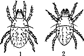 生活习性 桑始叶螨一年发生10余代,以成虫在枯枝落叶上或枝干裂隙或杂草上越冬。翌年春芽萌发即开始活动,移集叶背,沿叶脉交叉处吐丝结网,并在其中取食产卵,经一周左右孵化,再经2~3次脱皮,变为成虫。在高温干旱的夏秋季,一叶上有各类虫态,但在春秋季,每一世代历时可达20余天。卵发育温度8℃,最适25~26℃,湿度为60%。每小时降雨量在50毫米以上的暴雨时,可降低各虫态的虫口密度。 分布为害 桑始叶螨在中国、日本均有分布。中国的浙江、贵州、 四川等省常见成灾, 江苏也有,春初开叶时,主要是越冬成虫在叶背沿叶脉吸食,被害处呈半透明白斑,后逐渐变黄脱落,或刺伤叶脉,致叶呈缩皱畸形,使春梢基部,先发的1~3叶不能正常生长,夏秋季,则各代虫口密集为害,使叶脉附近白化,成为“花叶”,远离叶脉取食后,叶部呈现黄色小点,使全叶硬化。 防治 保持桑树桑地清洁,对枯枝落叶杂草应及时清除,以消灭越冬成虫; 在发生季节,可用波美0.2~0.4度的石硫合剂、80%敌敌畏1,000~2,000倍液、20%乐果500倍液或20%三氯杀螨醇5,000倍液进行喷布,也可喷洒清水以抑制虫口。 桑始叶螨mulberry miteEotetranychus suginamen-sis(Yokoyama),又称桑红蜘蛛。蛛形纲、蜱螨目,叶螨科。分布于北京、陕西、江苏、浙江、四川等省市;日本、印度也有分布。成虫体长约0.4 mm,椭圆形,橙黄色,背面隆起,腹面扁平,足4对。卵球形。幼虫初孵时淡黄色,足3对,脱皮一次后足4对,渐变橙黄色。成虫、若虫、幼虫吸食桑叶汁液,多在叶背沿叶脉为害,一年发生多代,以受精雌虫在落叶,树干裂隙中越冬。宜在冬季清除落叶,消灭越冬成虫;发生期用20%三氯杀螨醇2 000倍液或73%克螨特3 000倍液喷洒防治。 桑红蜘蛛 1.雌成虫 2.雄成虫 |