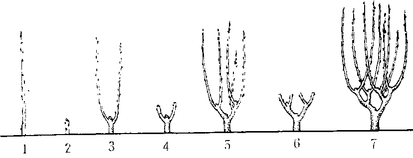 中干桑养成法 桑苗定植后发芽前,离地45~50厘米剪去苗干,养成主干。发芽后选留生长健壮,着生位置匀称的新梢3个,使长成枝条。第2年春发芽前,离地75~80厘米春伐,作为第1支干。发芽后每根支干选留2个新梢,使长成6根枝条。第3年春发芽前,将6根枝条离地110~130厘米春伐,作为第2支干,中干桑定型。发芽后疏芽留芽。第4年春蚕期在枝条基部或稍高处进行夏伐收获桑叶,桑园开始成林,进入盛产期。 高干桑养成法 养成步骤和剪定方法与中干桑基本相似,仅主干高度较高,支干层次较多,养成年限稍长,可参照中干桑养成方法,分年剪定养成。 杈子桑 淮北地区素有以桑树培养成桑杈的技术,以供农村打场、堆草之用的习惯。其法是:挖掘较大的植穴,多施基肥,每穴栽实生苗3~5株。实生苗在栽植当年,不加修剪,任其生长。第2年春发芽前,齐地剪去枝干,发芽后每株留1个芽,其余疏去。新枝长到150厘米时摘芯,养成杈干,摘芯后长出的侧枝,除留上端4~5个外,其余的分次除去,留侧枝的部位,就是培养杈枝的地方。第3年春发芽前,把全部侧枝从基部留1个芽处剪去。这样就能促使侧枝基部萌芽4~5个。待新芽长到10厘米左右时,选留位置适当的芽2~4个,培养成杈股。同时在杈股对面留1侧枝,成为杈辫。第4年继续培养,冬季砍下,经过整形即成3~4股的桑杈。 条墩桑 分布于西北华北部分地区,常栽于土地分界处,冬季收割枝条,作为编织材料,也有防风固沙作用。近年来已适当采用桑叶,条墩桑用压条或分根法繁殖,属实生桑类型,具有分蘖性强,枝条细直等特性。由于多年割条分蘖,根桩逐年扩大,成为桑墩。 桑树树形养成mulberry type training培养桑树树形的过程。即运用伐条、疏芽、整枝、摘芯等剪伐技术,把桑树培养成一定形状,适于栽培要求与采叶养蚕。桑树树形有地桑(无干桑)、低干、中干、高干等。 |