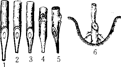 释义 | 桑苗袋接法mulberry sapling pockt grafting桑苗嫁接法之一。嫁接方法按剪、削、插、壅4个步骤进行。剪:将砧木根颈部稍下方剪成平滑斜面;削:接穗削四刀削成;插:用手指捏开砧木剪口皮层,使与木质部分离成口袋状,然后将接穗削面对正砧木皮层,缓缓插入皮与木质部之间;壅:再用泥土培壅接合部。此法操作简便,成活率高,适于大量繁育桑苗。袋接时期在早春树液开始流动时。 袋接 1. 第一刀削成的接穗 2. 第二刀削成的接穗 3. 第三、第四刀削成的接穗 4 .接穗背面 5. 接穗侧面 6. 插接穗和壅土 |