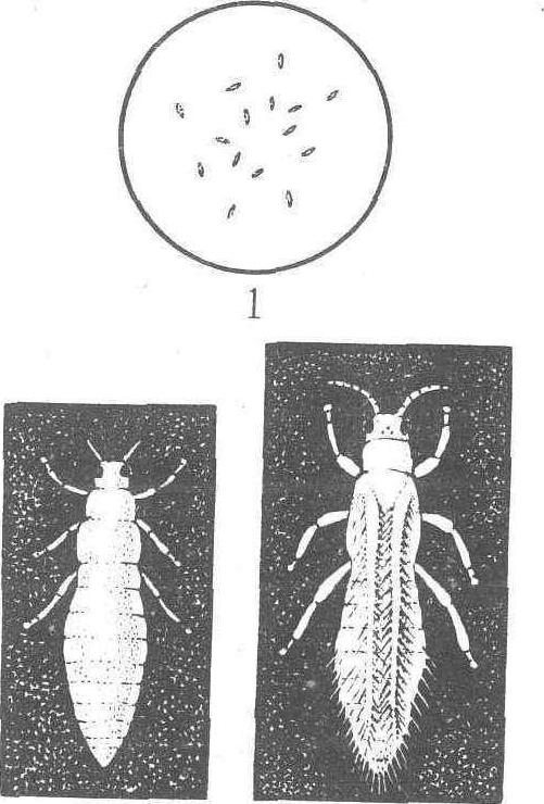 生活习性 桑蓟马一年发生10代左右,以最后1代成虫在枯枝落叶、树皮裂隙、杂草中越冬。越冬成虫于第2年春叶萌发时即开始活动,在叶背为害,爬行时常把尾端上举,一遇惊动,即翘尾而逃。各代雌成虫在新梢顶端1~3叶上爬行,寻找适当产卵部位,以锯齿状产卵器在嫩叶背面主、侧脉分叉间及其附近的叶肉组织表皮内产卵,一生产50~70粒,寿命7天左右。雄虫交尾后3~5天即死,卵期5~7天,蜕皮3次,共经10~13天羽化。 分布为害 桑蓟马在中国各省蚕区和日本都有发生。在桑树上的虫口密度自春至夏逐渐上升,夏伐时集中在春伐田块及补缺桑株上,夏伐株新梢抽长后,虫口重又回升,7月中旬起各种田块虫口密度均较高,为害普遍严重。晚秋蚕期虫口密度又再度下降。第4代(7月间)起世代重迭现象严重,通常上代若虫在4~8片叶上吸汁,下代成虫又在新梢嫩叶上产卵,随着新梢的持续向上生长,造成不断由下而上,分层受害的现象。因此,各期秋蚕适熟叶干、萎、褐、锈、无可利用,严重地影响了蚕茧生产。 防治 冬季清洁桑园,收集枯枝落叶、杂草,集中处理,消灭潜藏越冬成虫。在发生数量多时,可喷用40%乐果乳油1,500倍液、80%敌敌畏乳油2,000倍液、或20型洗衣粉200倍液,均有防治效果。 桑蓟马mulberry thripsPseud odendrothrips moriNiwa,缨翅目,蓟马科。日本及中国各蚕区均有分布。成虫体长0.75 ~ 0.9 mm,纺锤形,淡黄色,有两对狭长透明的翅,边缘生长毛。卵椭圆形,透明白色。若虫与成虫相似,体略小,无翅。成虫和若虫用口器锉破桑叶或叶柄组织吸吮汁液。一年发生多代,以成虫在枯枝落叶、虫孔裂隙、杂草中越冬。用40%乐果1 000倍或80%敌敌畏、50%辛硫磷、40%氧化乐果1 500倍液喷治。 桑蓟马 1.成虫 2. 若虫 桑蓟马属缨翅目。蓟马科。为害桑叶的害虫之一。多化性,卵生,成虫越冬。高温干旱条件下为害严重。初孵若虫白色,半透明。约0.2毫米,渐变黄色。成虫纺锤形、淡黄色,有翅能飞能舞,大小约1毫米左右。成、若虫以锉吸式口器刺破桑叶,吸吮液汁,使叶片硬化,萎缩卷曲。防治方法:1.消灭桑园内的越冬成虫。2.夏秋季虫口密度高时用40%乐果乳油1000倍液连喷两次,其间间隔15—20天(喷药后5天可采叶喂蚕)。 |